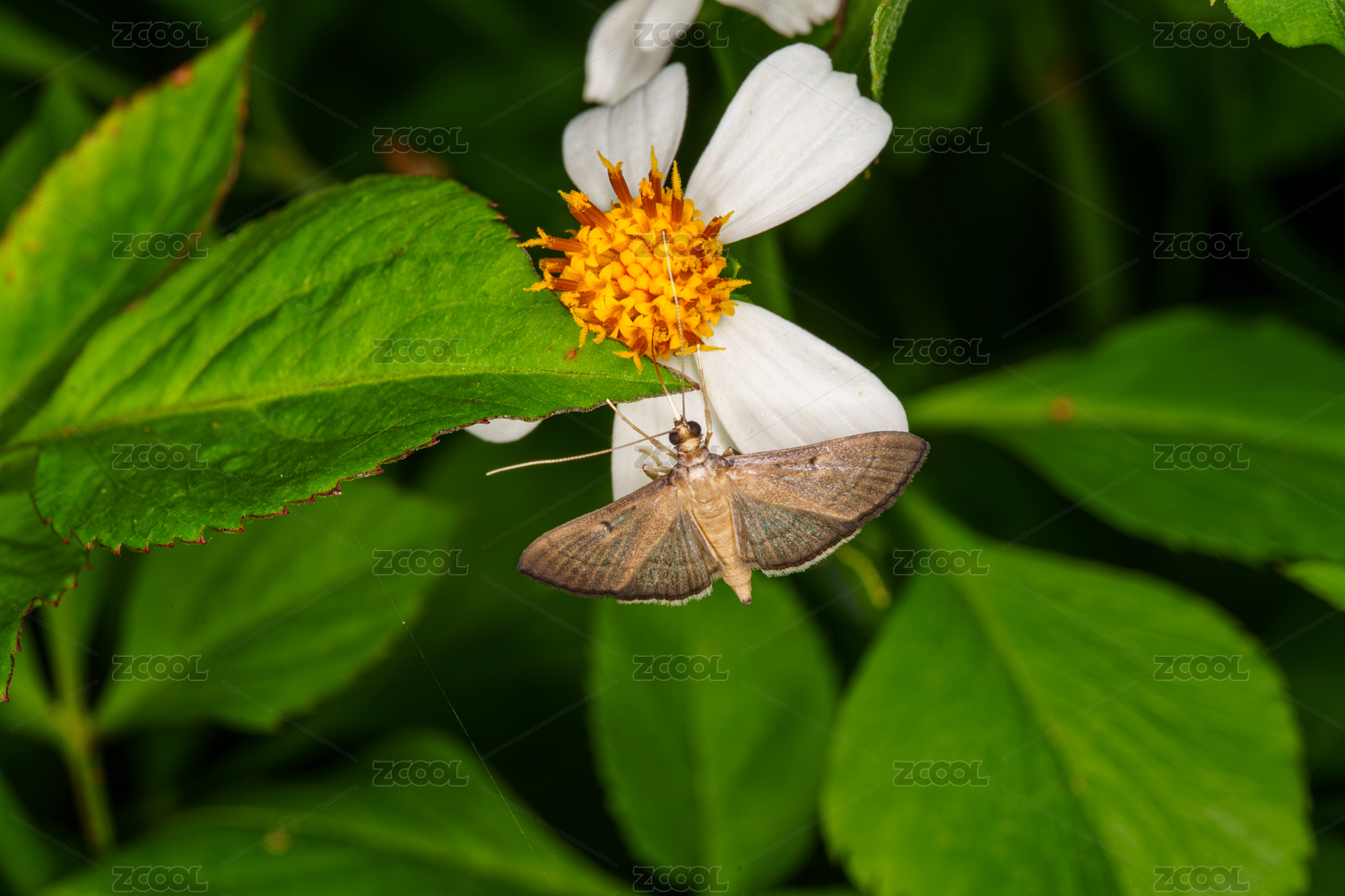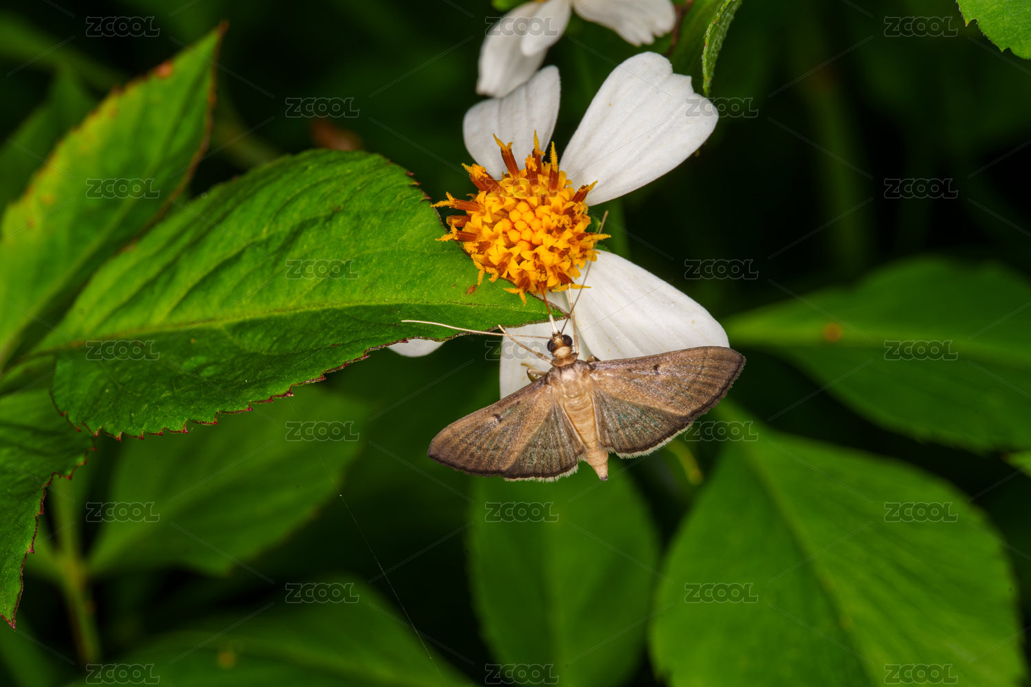 白花朵上停駐的棕色飛蛾