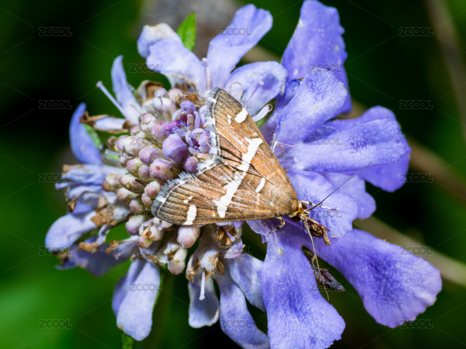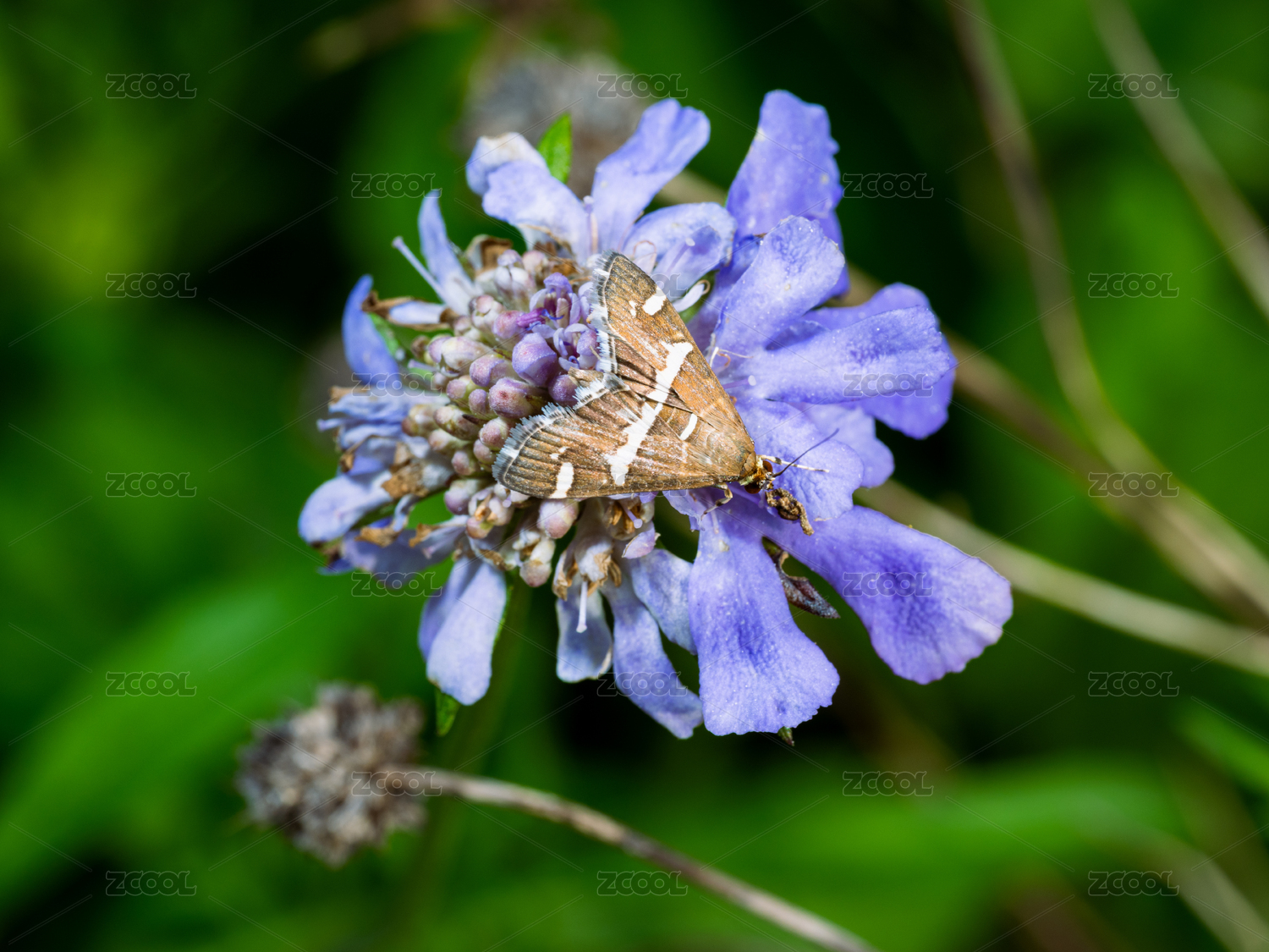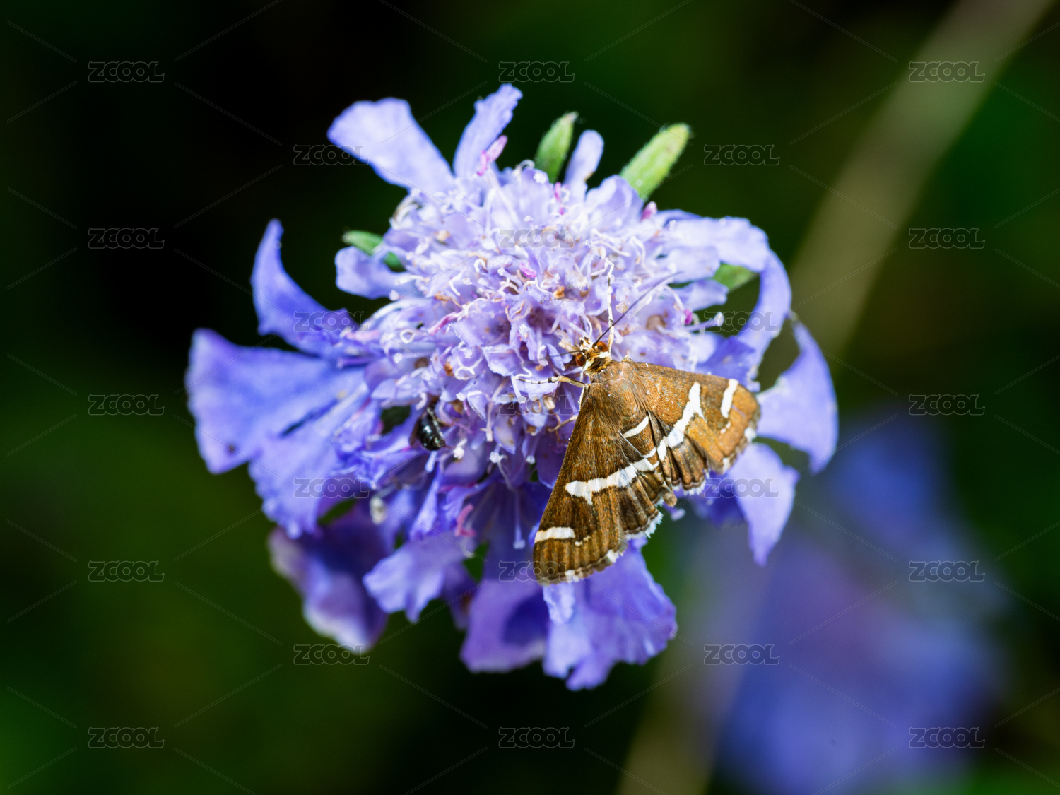 飛鴿藍盆花上的飛蛾微距特寫