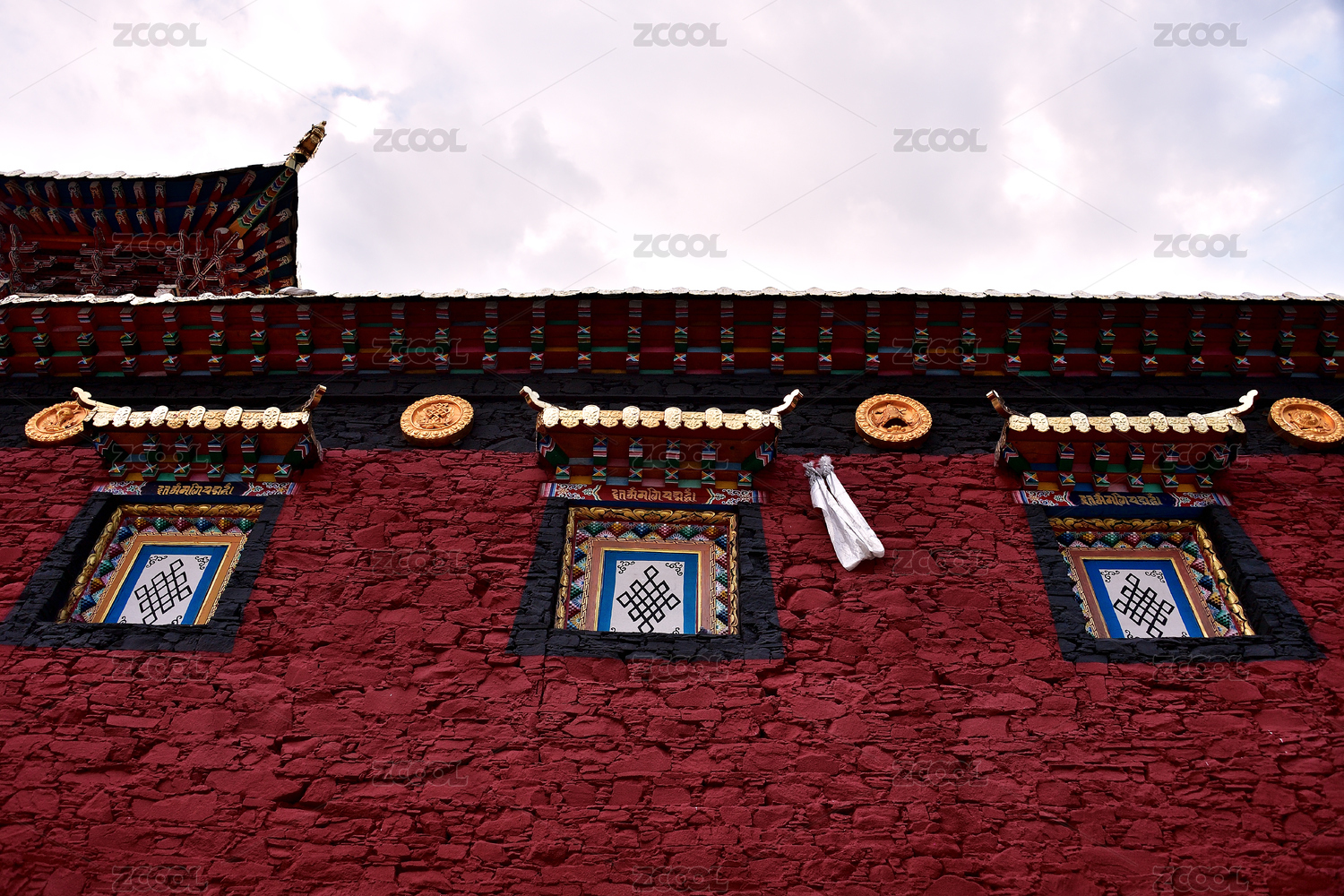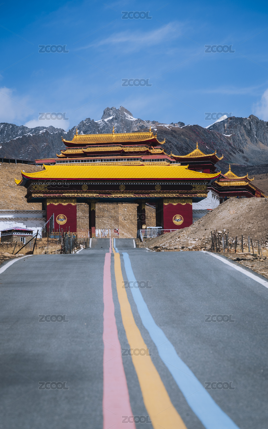 中國四川,塔公寺紅門上的哈達(dá)與經(jīng)幡裝飾