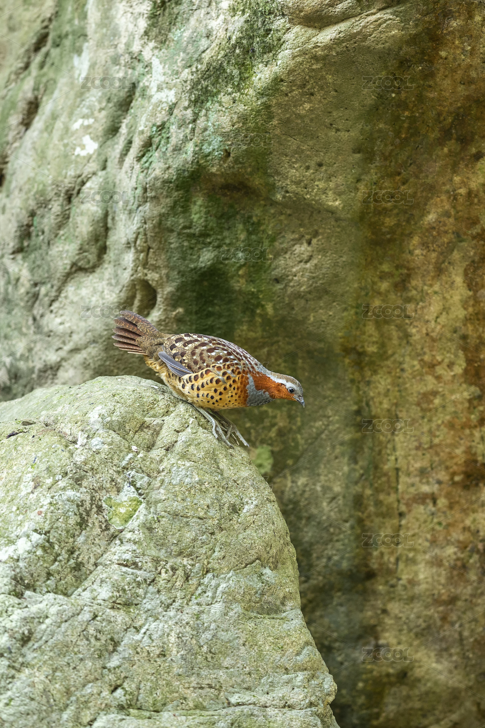 一只灰胸竹雞于山區(qū)巖石坡地灌叢中覓食嬉戲