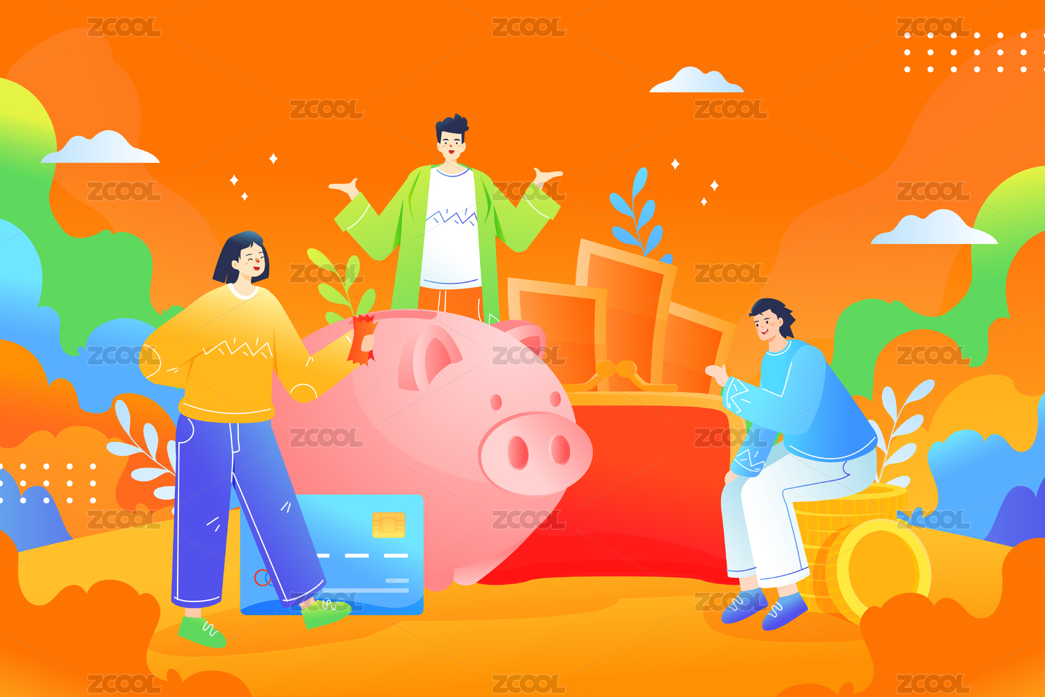 卡通存錢理財信用卡禮包金融活動背景矢量插畫