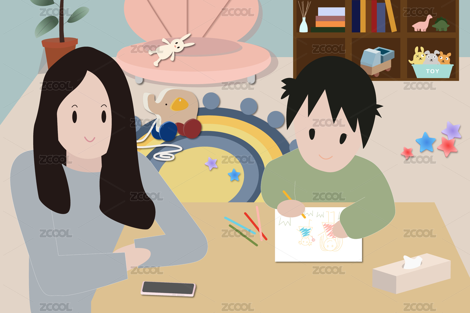 兒童房里媽媽看著孩子在畫(huà)畫(huà)