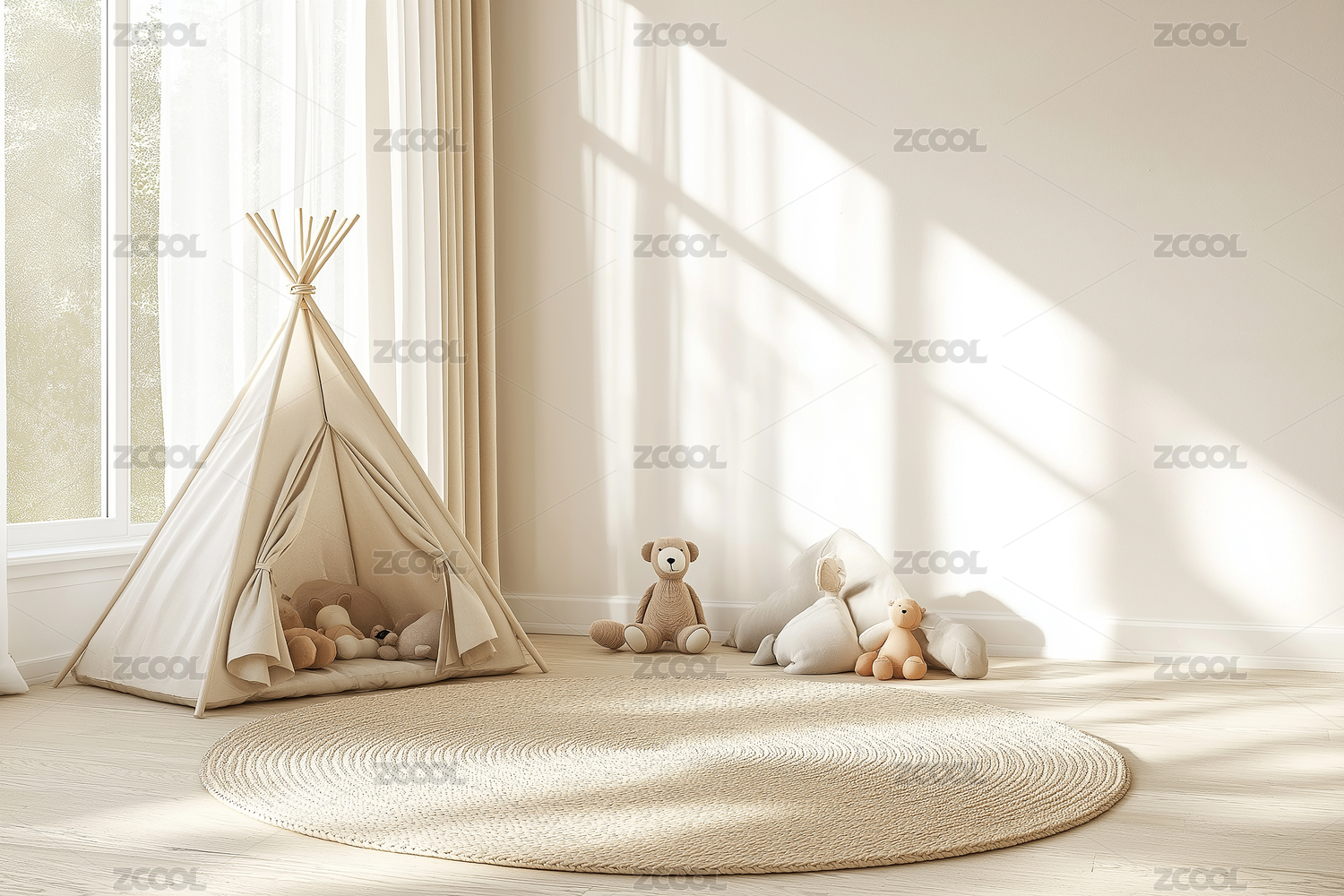 兒童房間一個(gè)小型帳篷和毛絨玩具
