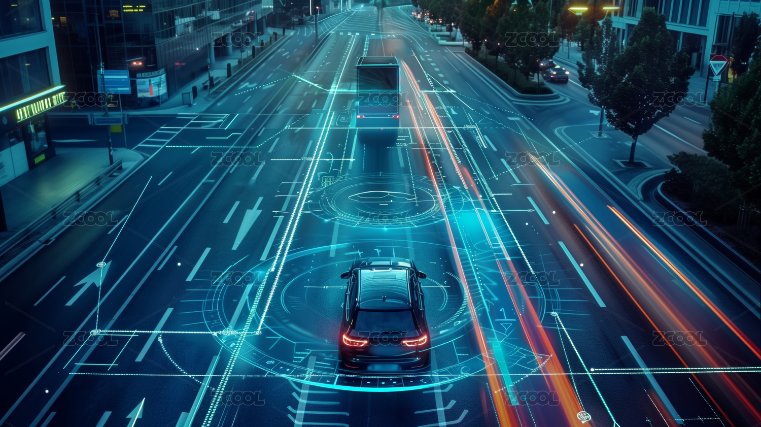 未來都市的夜色中奔馳的自動(dòng)駕駛汽車