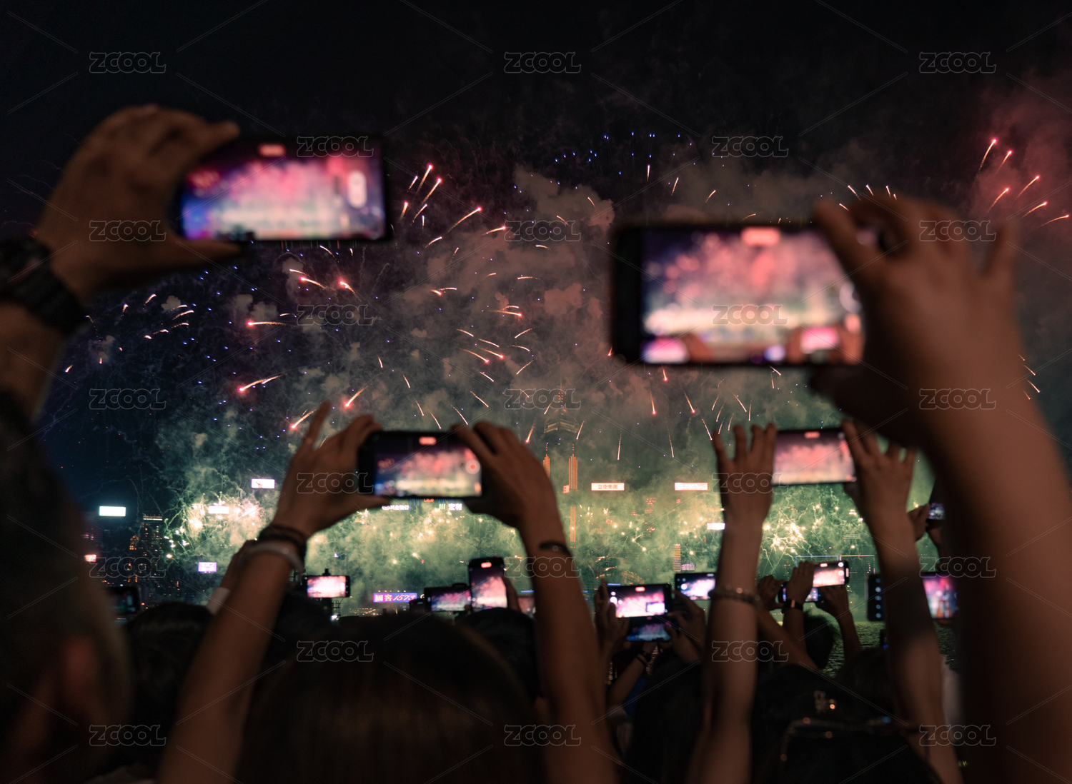 中國(guó)香港維多利亞港眾人記錄國(guó)慶煙花秀