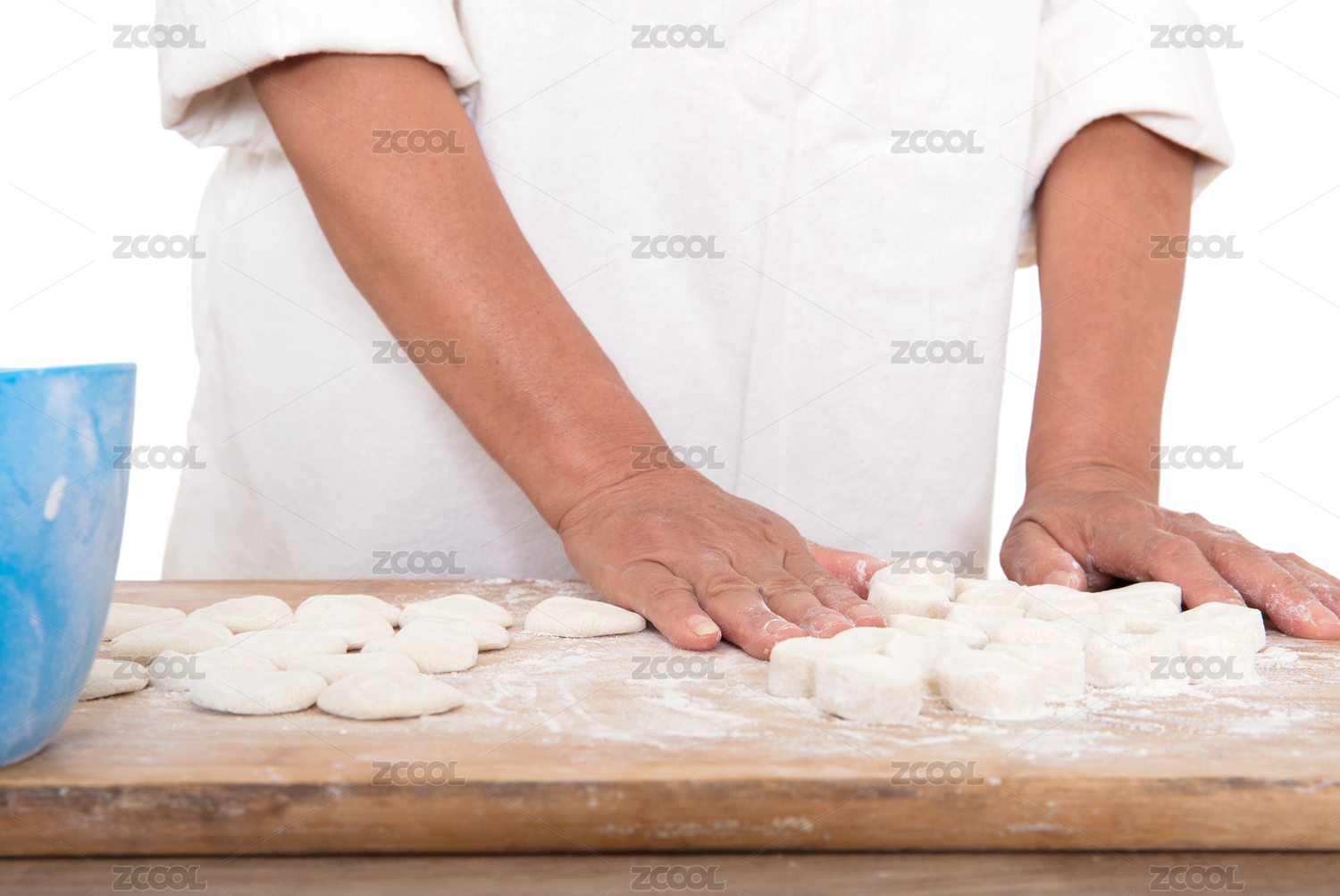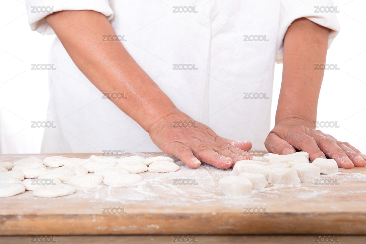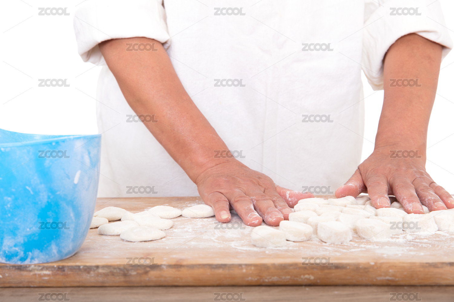 后廚面點師把小面團逐個按壓成小圓餅
