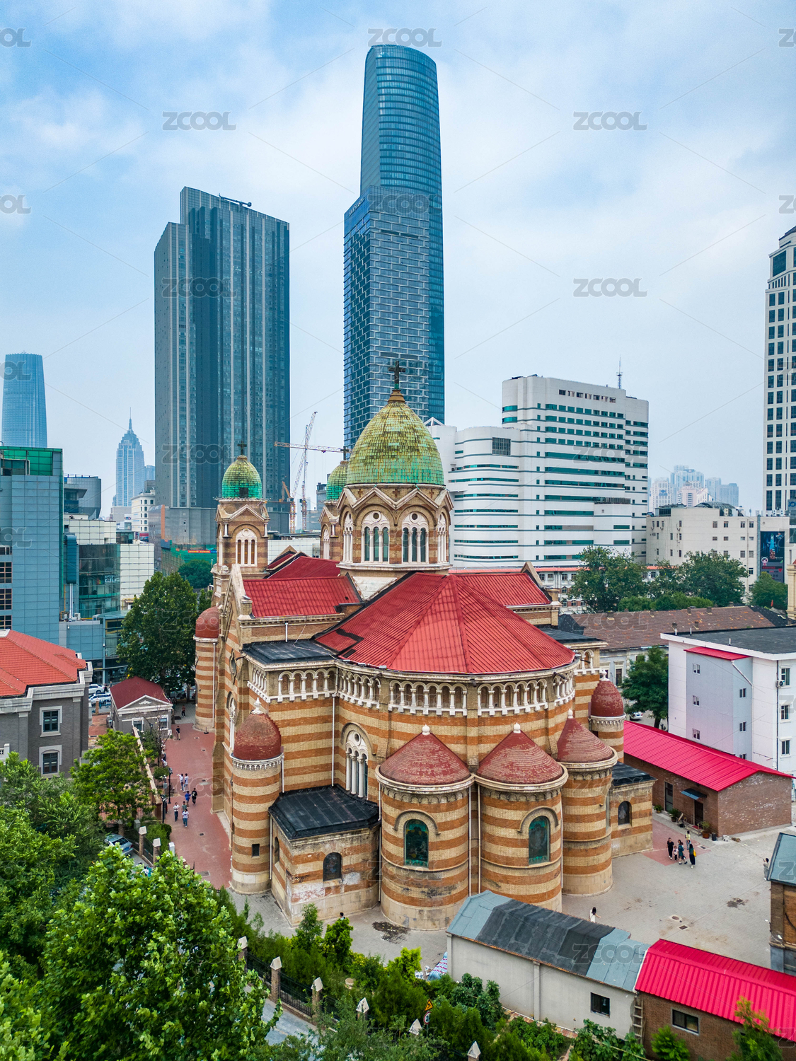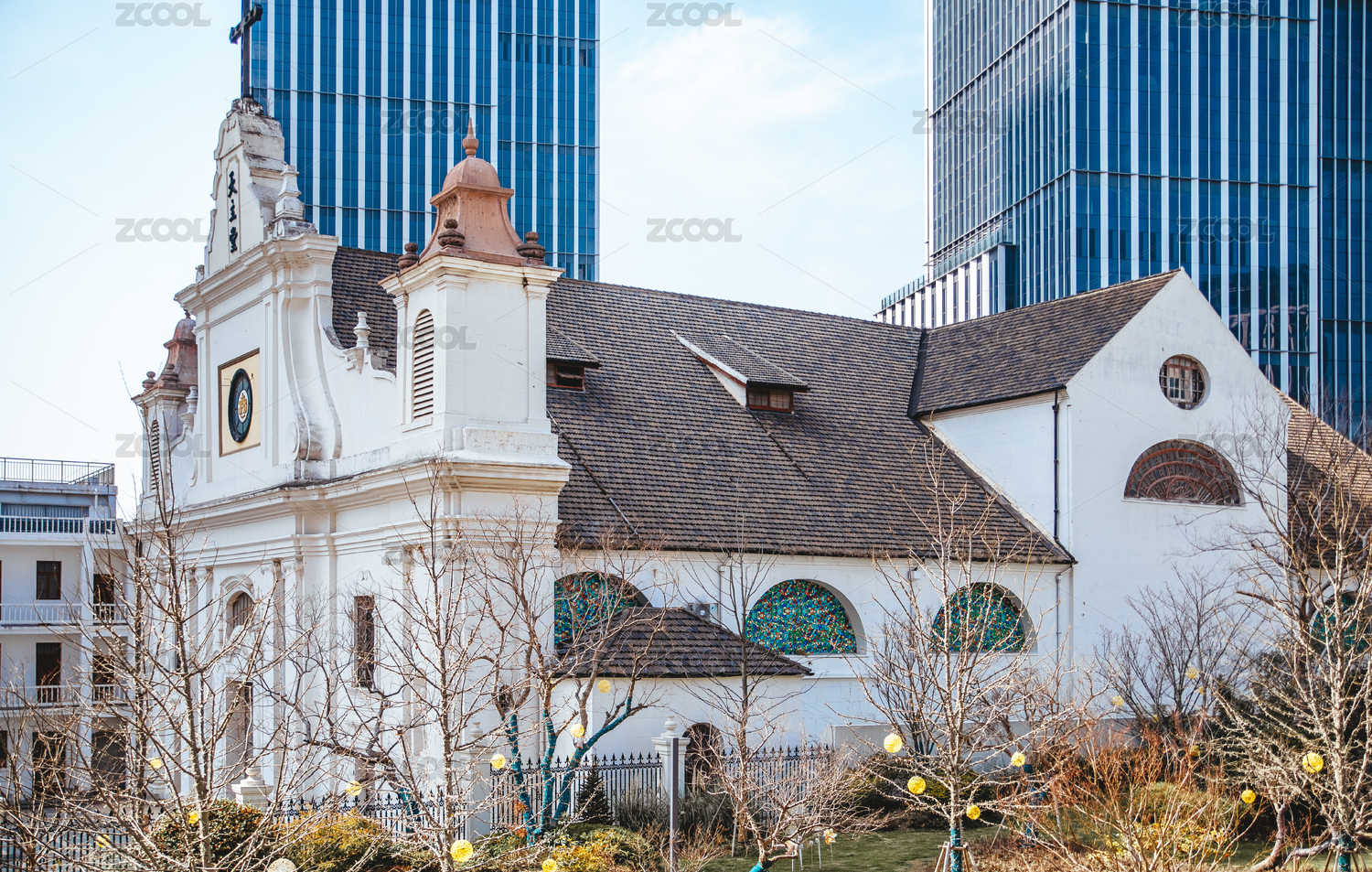 沈陽小南天主教堂藍天白云與現(xiàn)代建筑