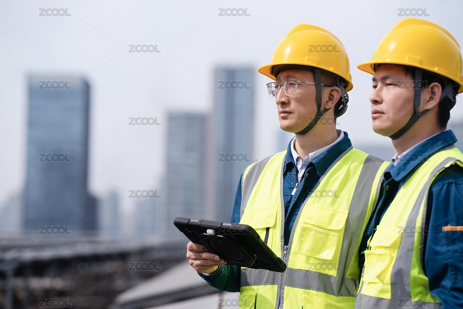 頭戴安全帽手拿圖紙的工程師,望向遠方建筑
