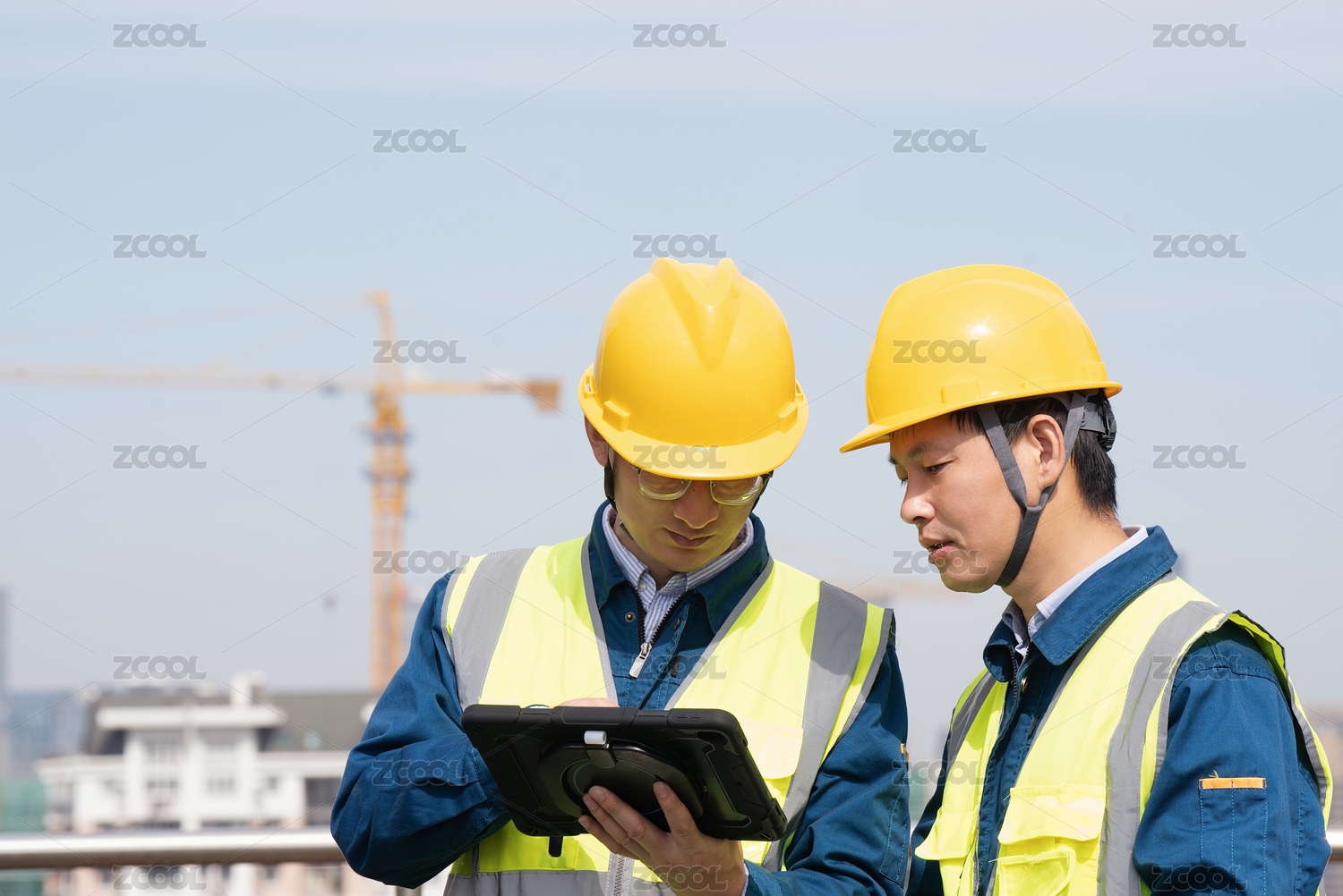 戴安全帽、護目鏡、口罩的工程師低頭看圖紙