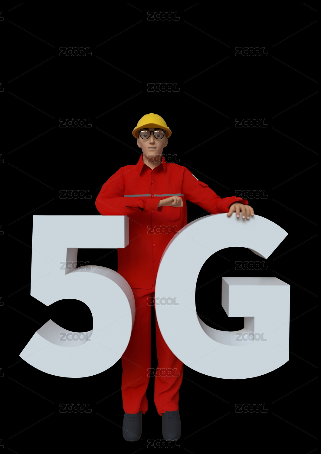 頭戴黃色安全帽身著紅色工服的卡通工程師5G網(wǎng)絡(luò)