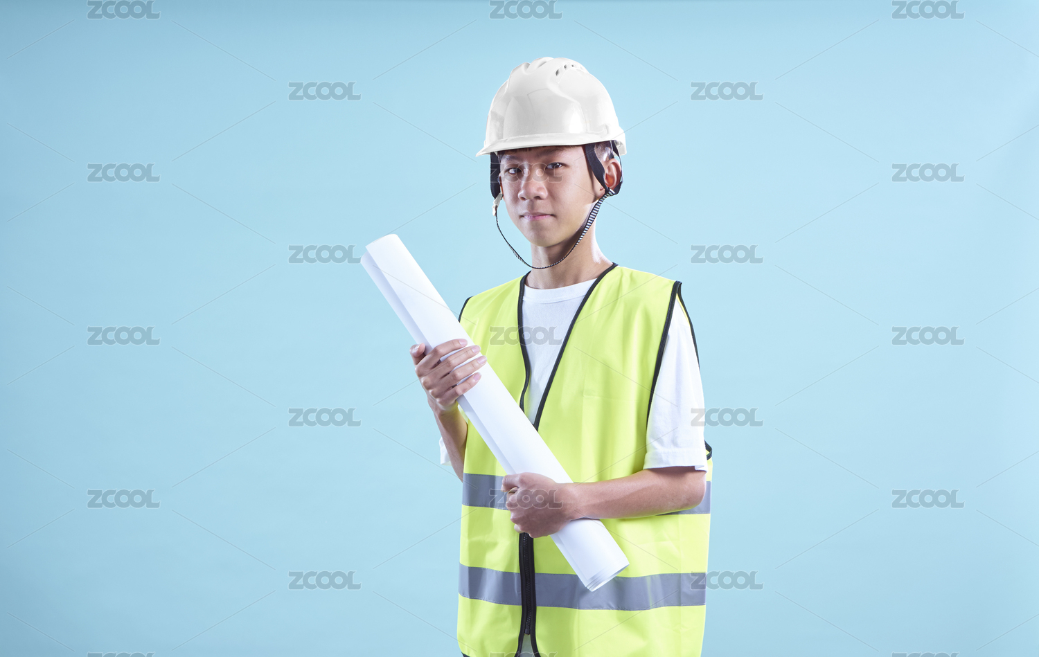 戴安全帽、護目鏡、口罩,手拿圖紙的工程師