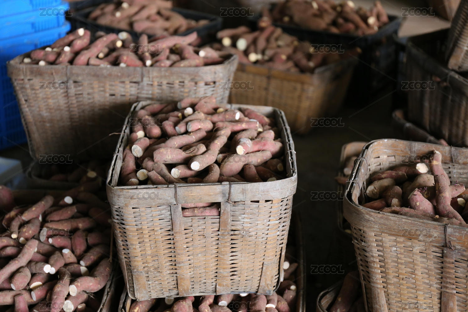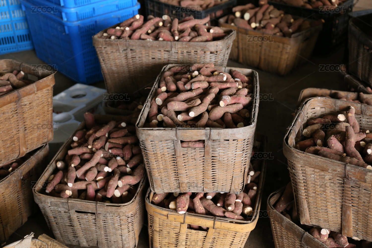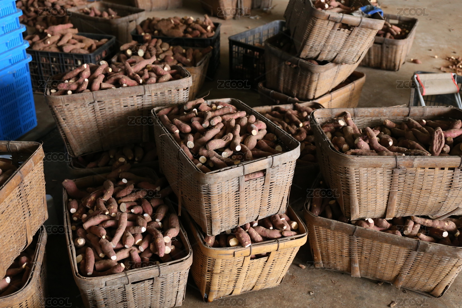 堆放在籮筐里的紅薯干原料