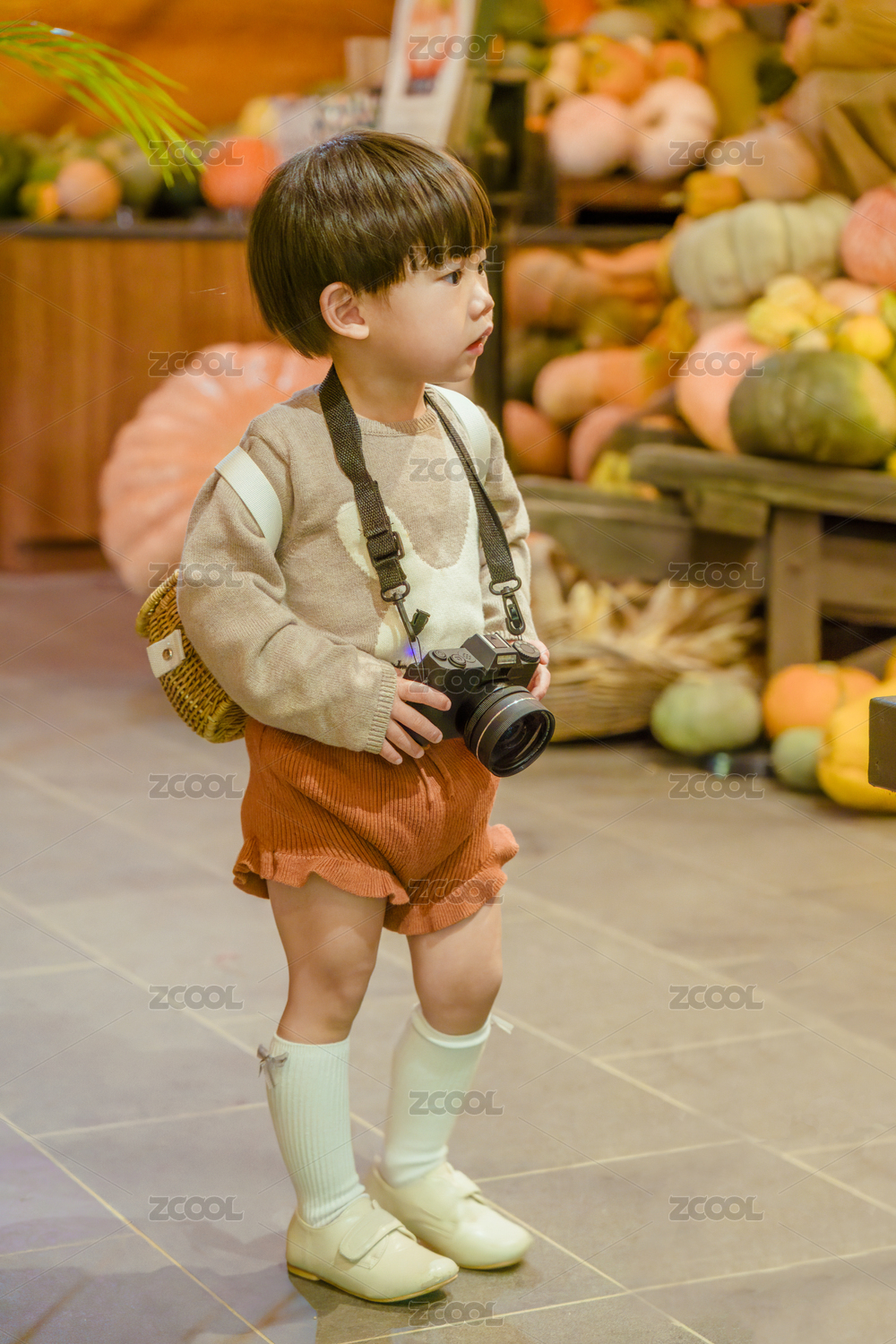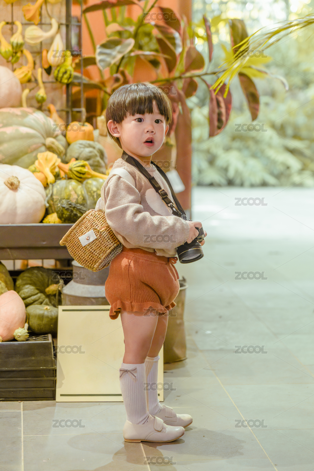 奇異南瓜園里取景拍照的背籮筐小男孩