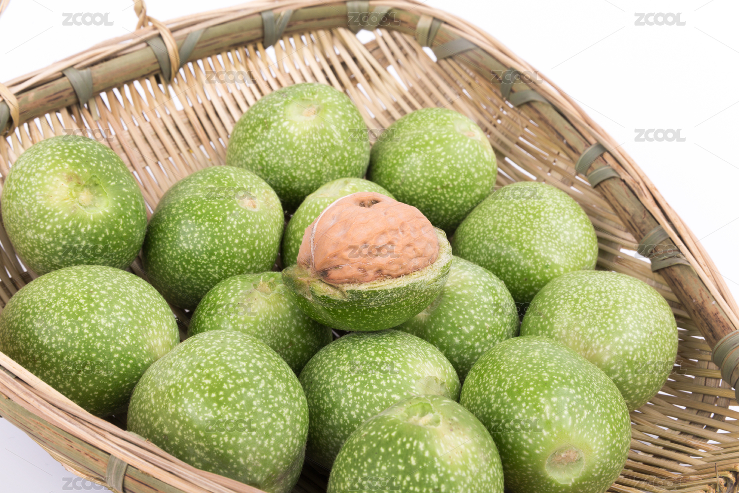中式手工籮筐里的青皮核桃
