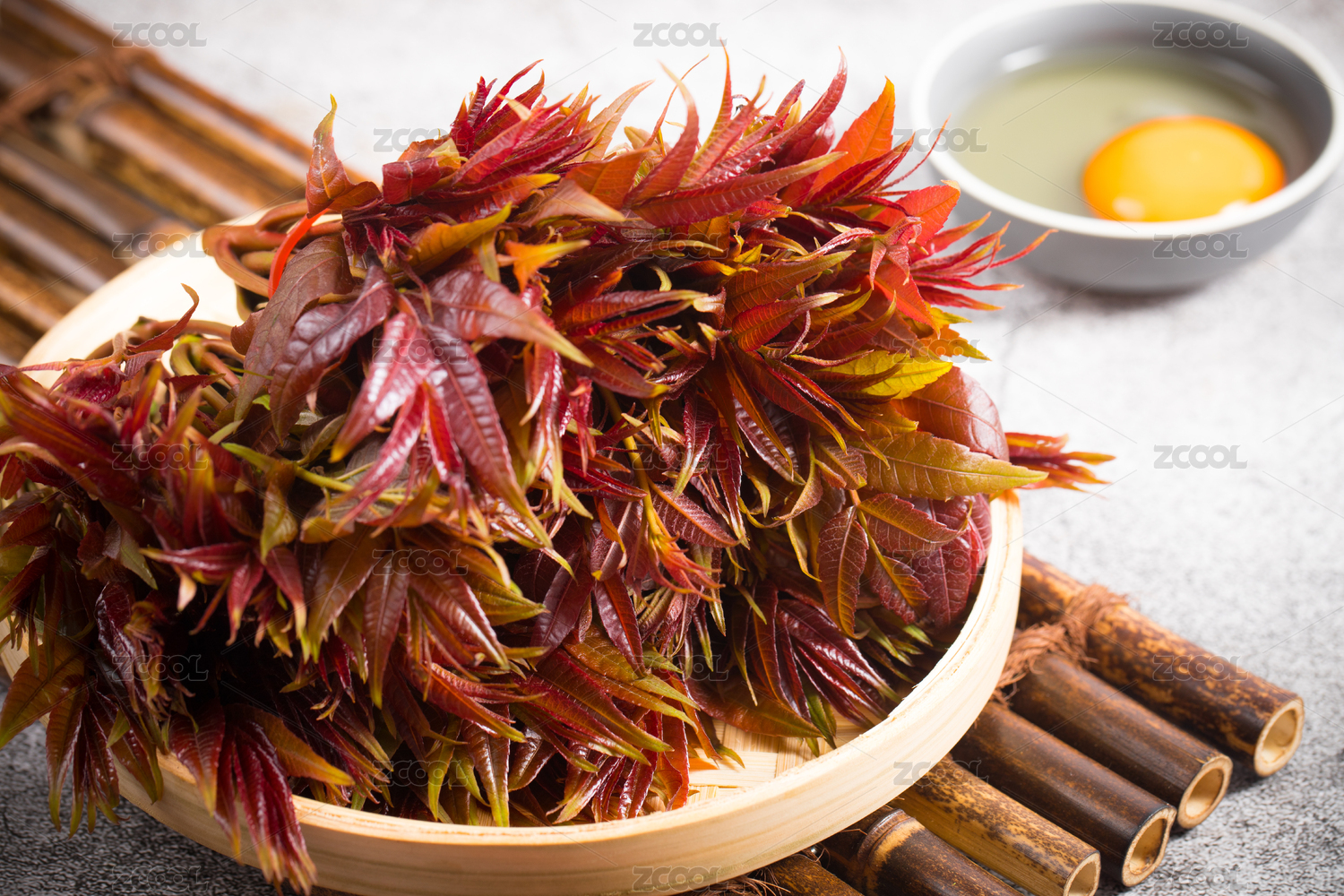 放在竹簸箕籮筐里的新鮮蔬菜香椿