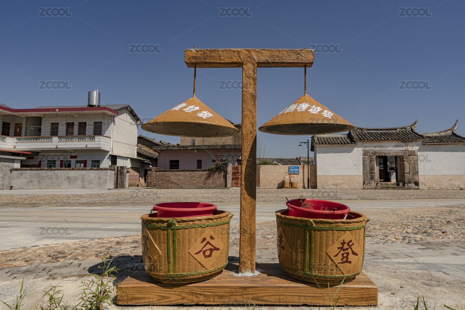 上杭客家圍屋前籮筐改造的垃圾筒,中國福建