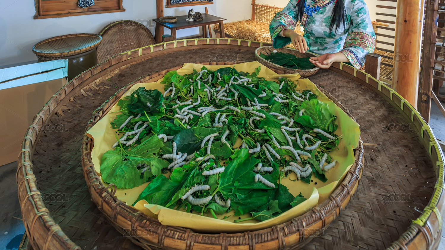 女孩籮筐養(yǎng)蠶場景