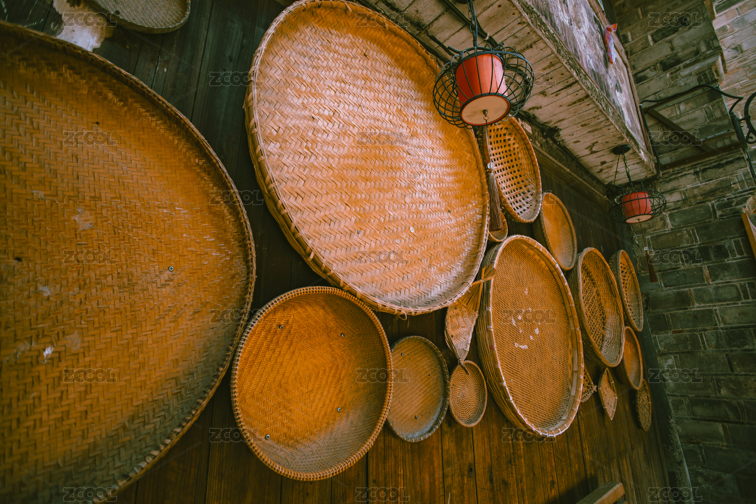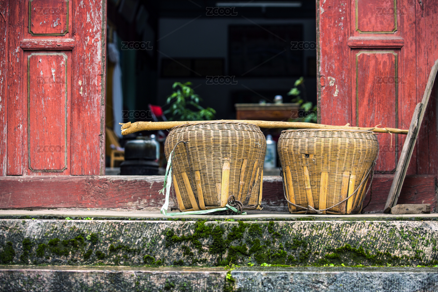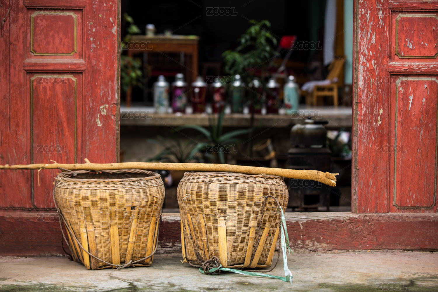 中國云南昆明鄉(xiāng)下農(nóng)家小院門口擺放的竹籮筐