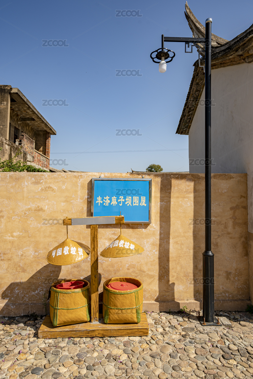 中國福建上杭客家圍屋前籮筐改造的垃圾筒