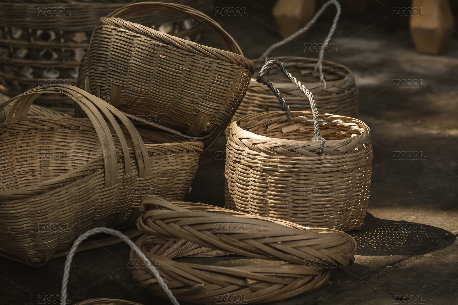 一些放在地上的手工制作的籮筐