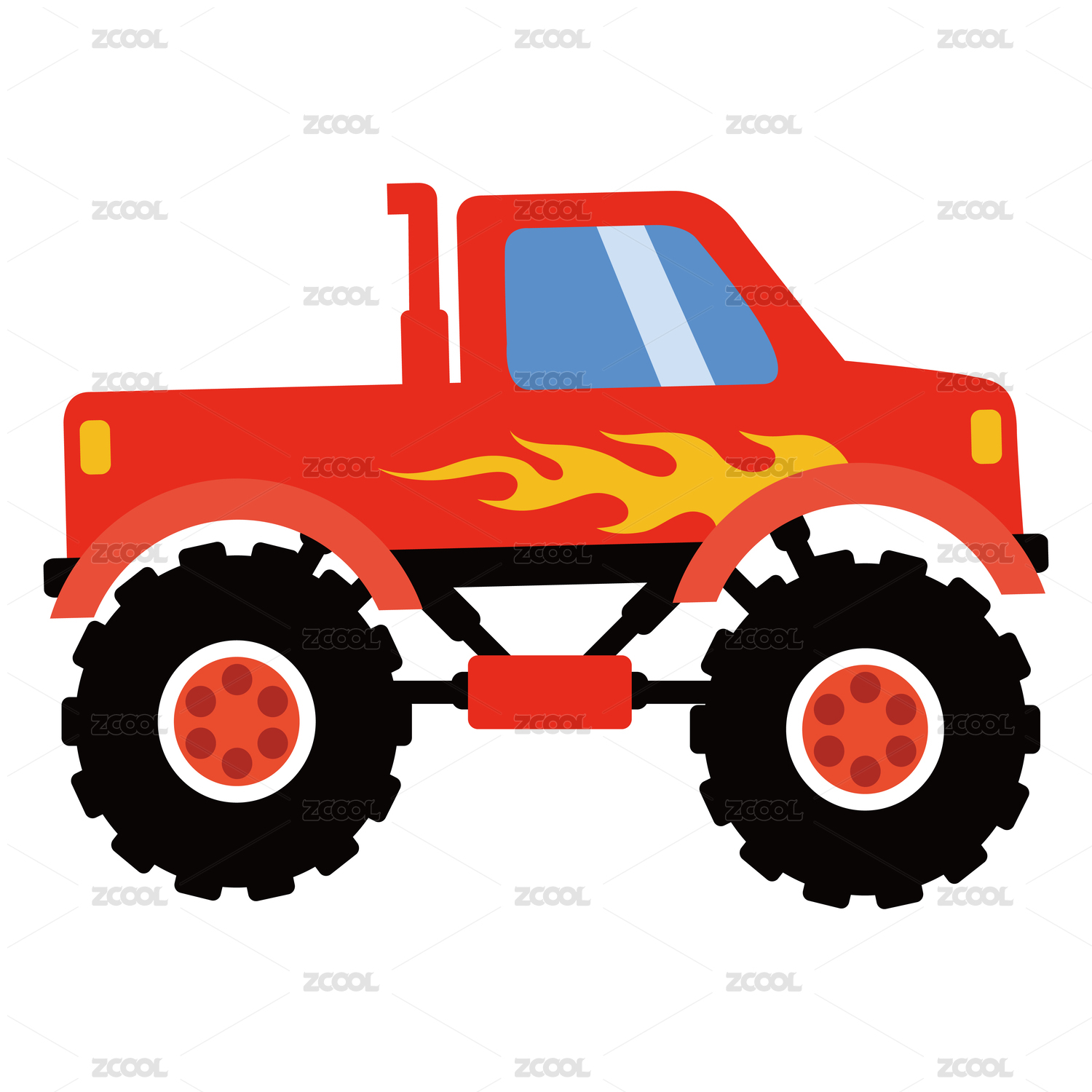 紅色卡通帶火焰的怪獸巨輪大卡車