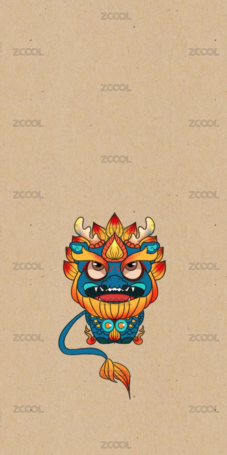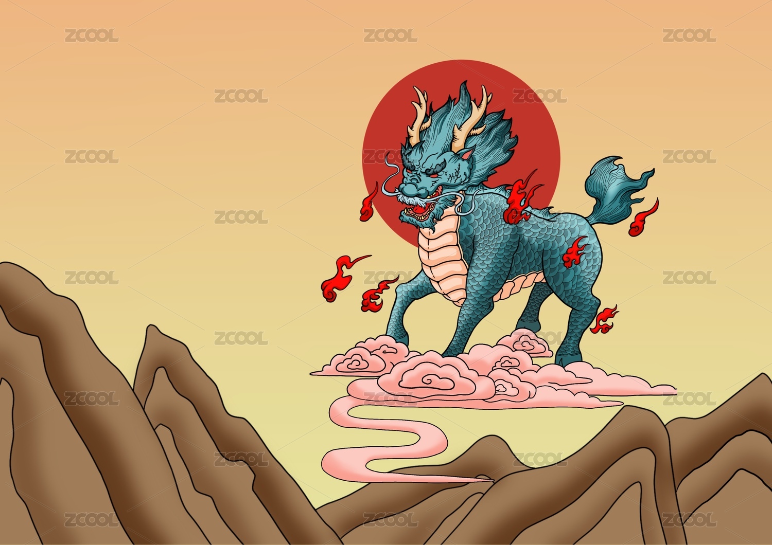 兩只麒麟和繡球祥云中國傳統(tǒng)紋樣國潮插畫