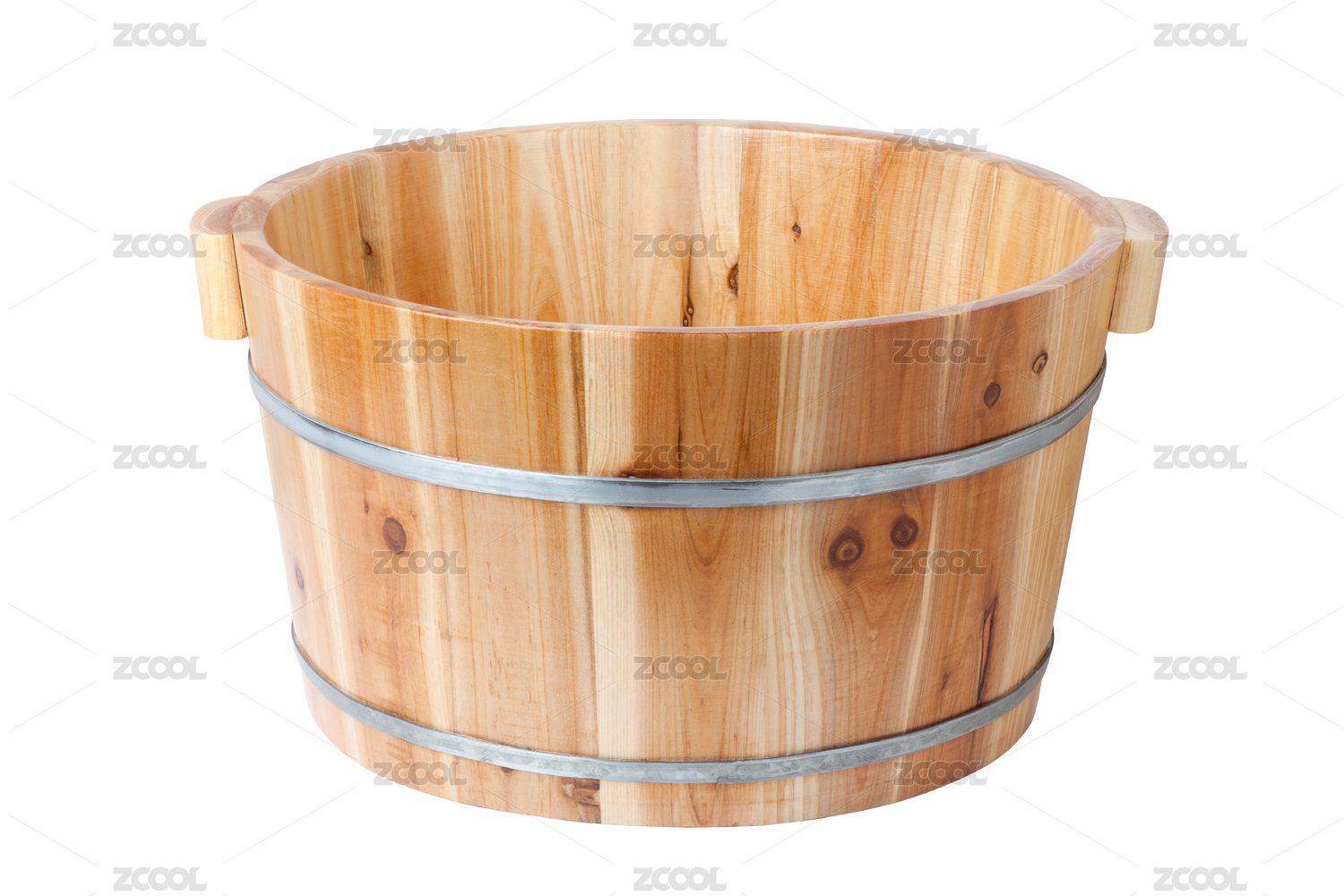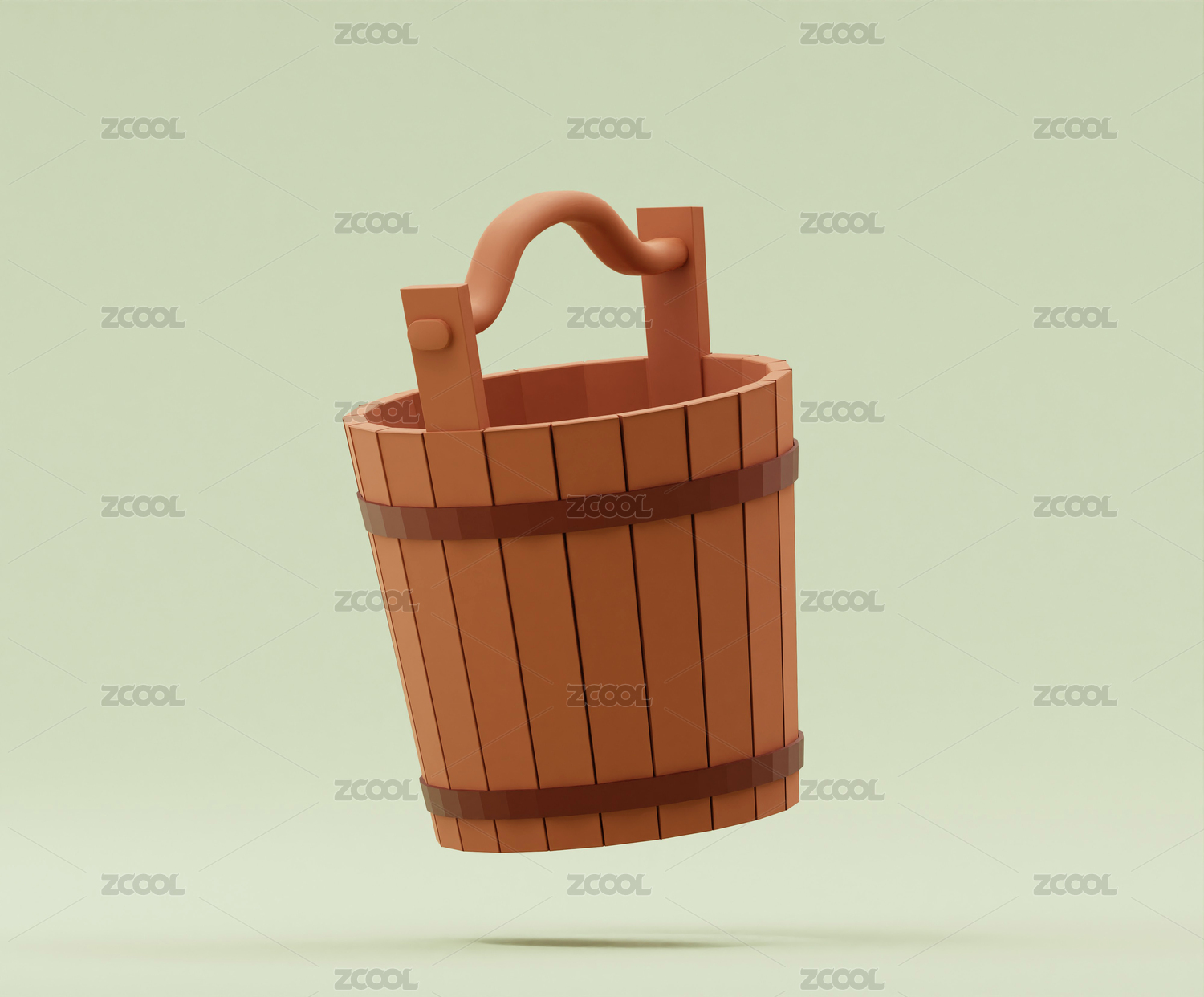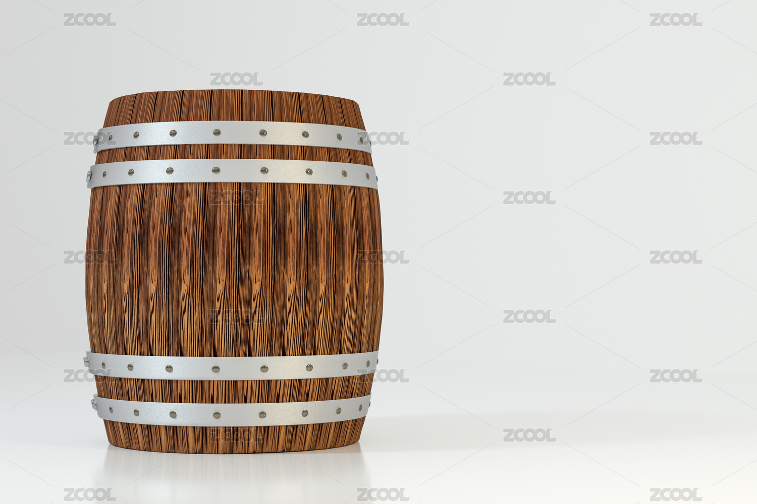 兩邊金屬固定的木紋木桶容器,白色背景,三維