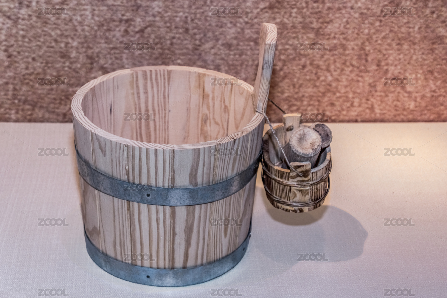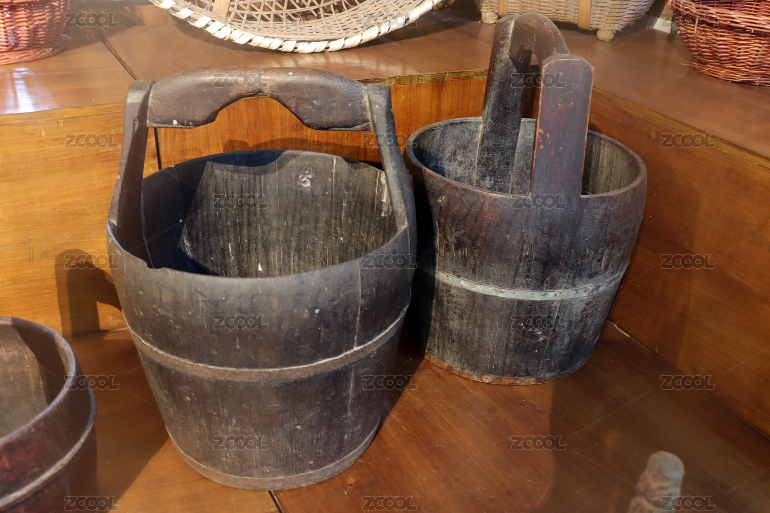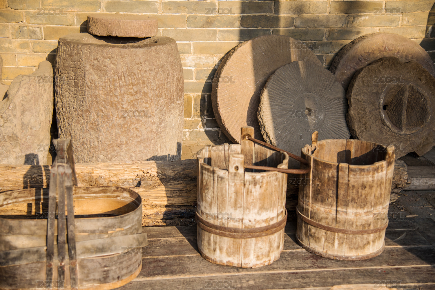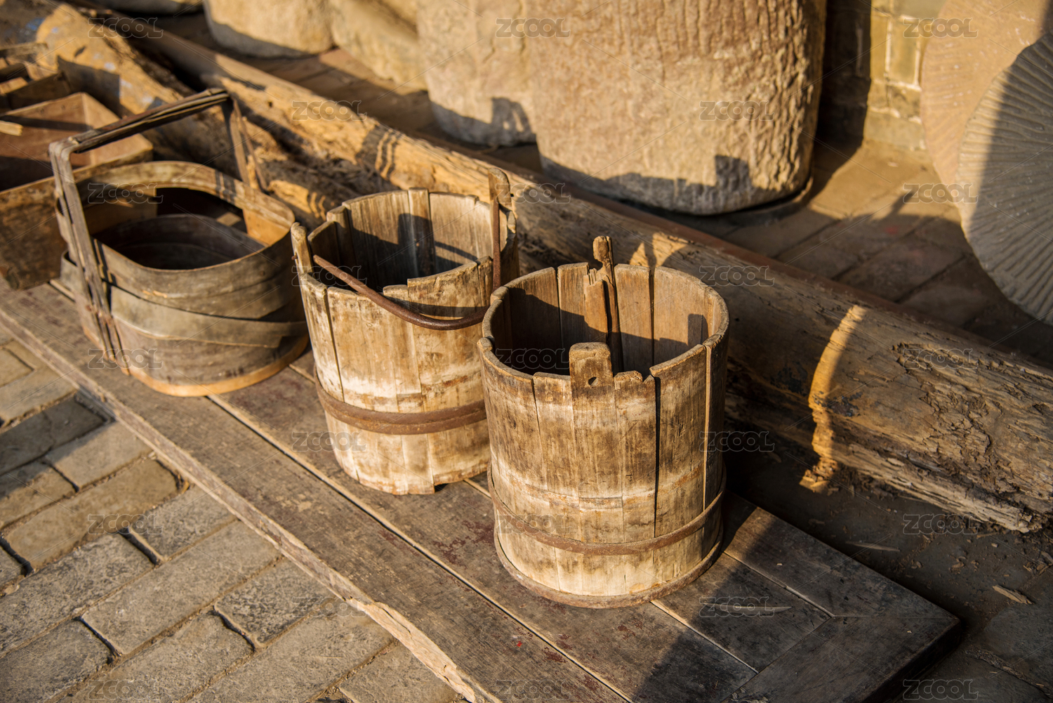 古時(shí)用的水桶和石磨碾盤(pán)特寫(xiě)