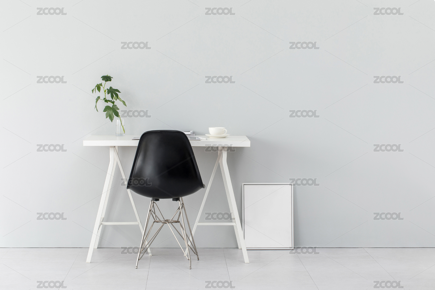 淺灰色空白背景墻前有個(gè)白色書(shū)桌和張黑色的椅子