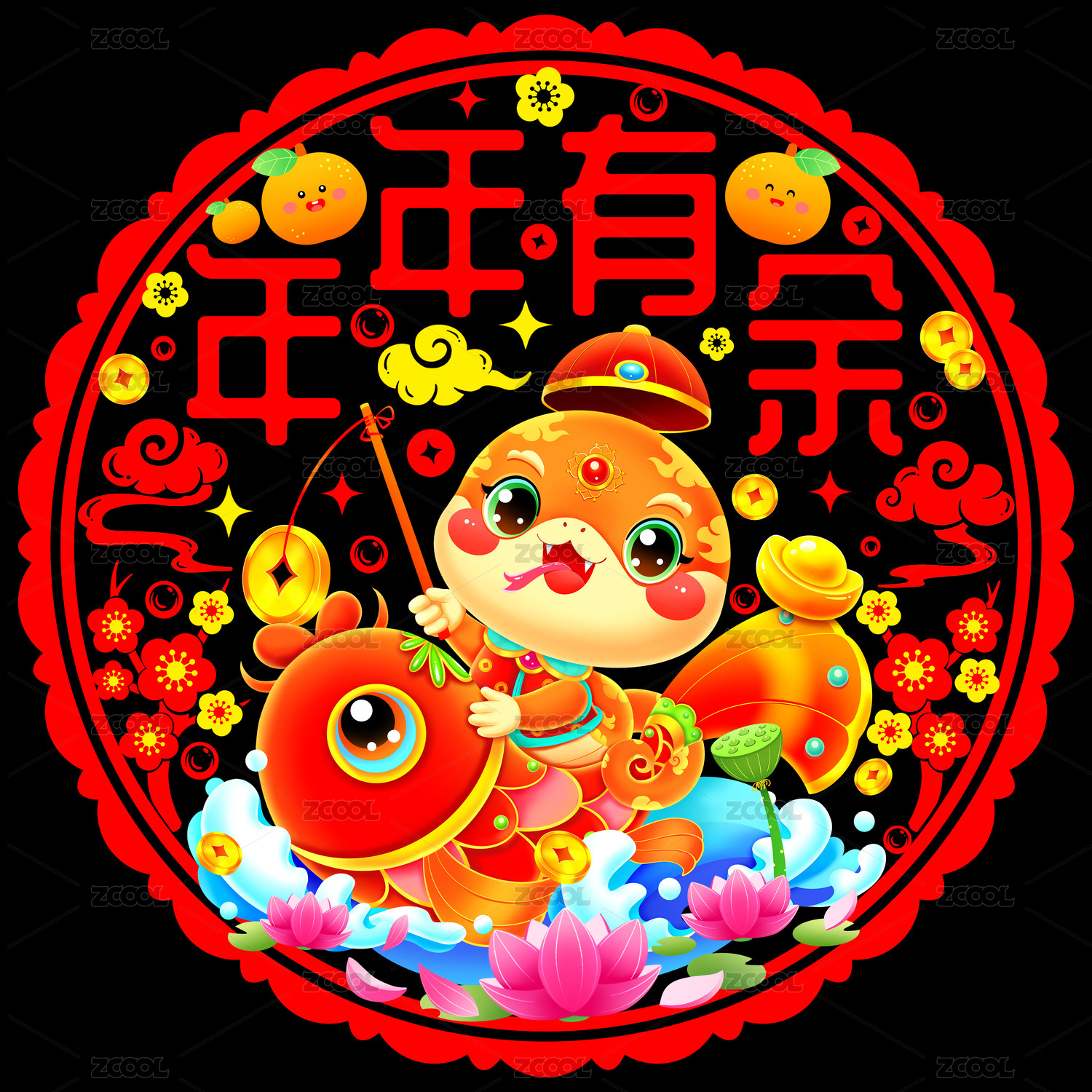 國(guó)潮春節(jié)新年蛇年生肖錦鯉蛇釣魚窗花