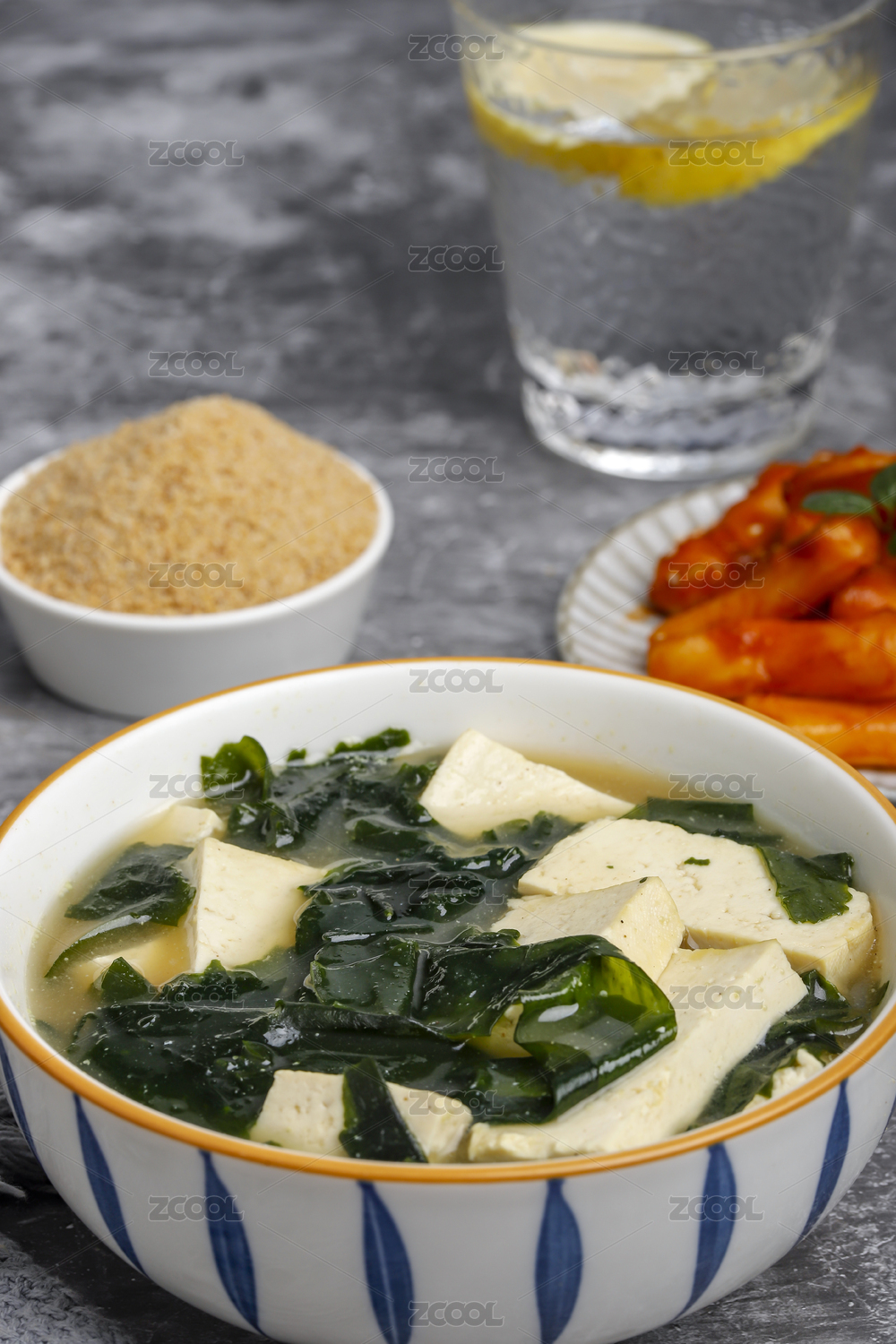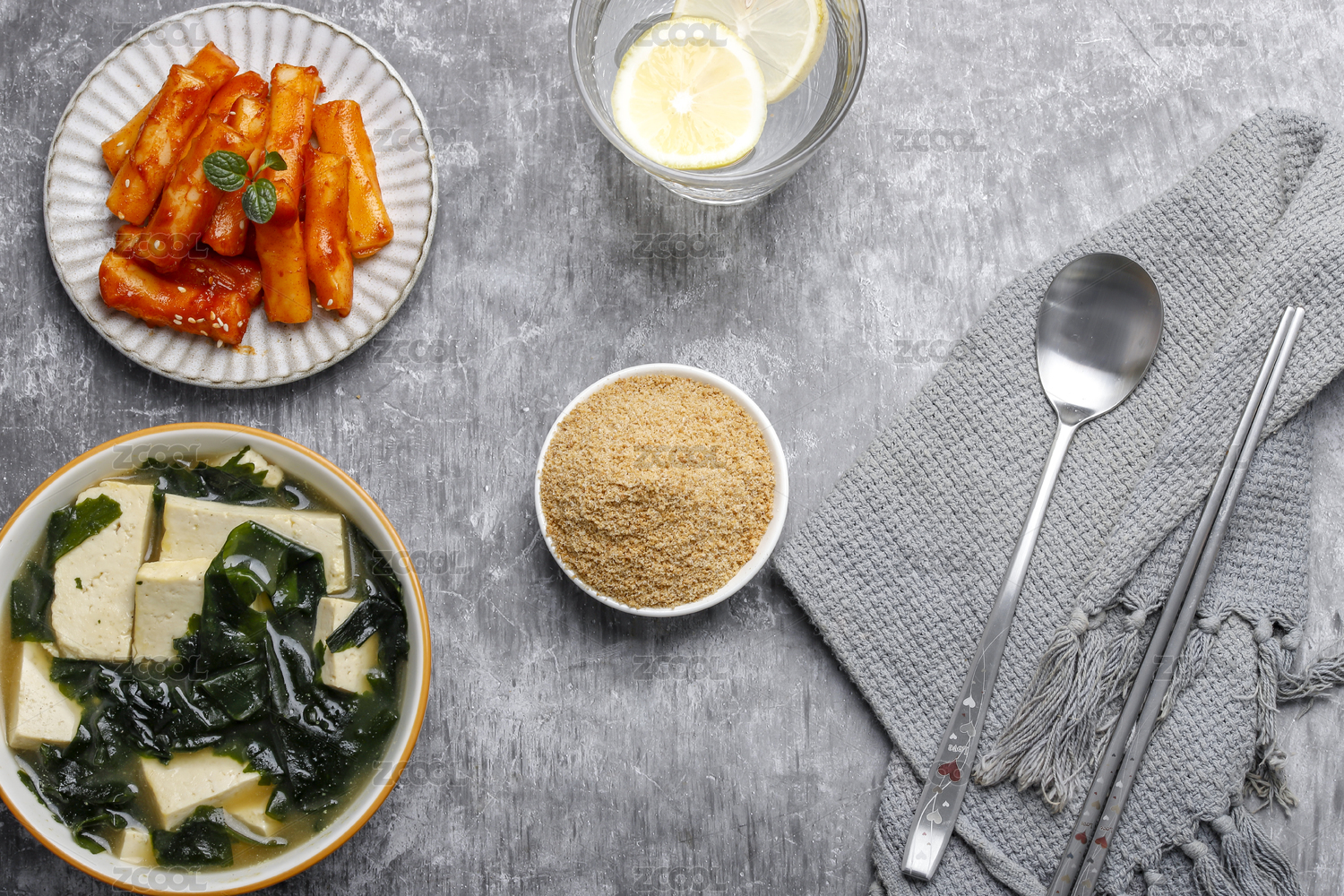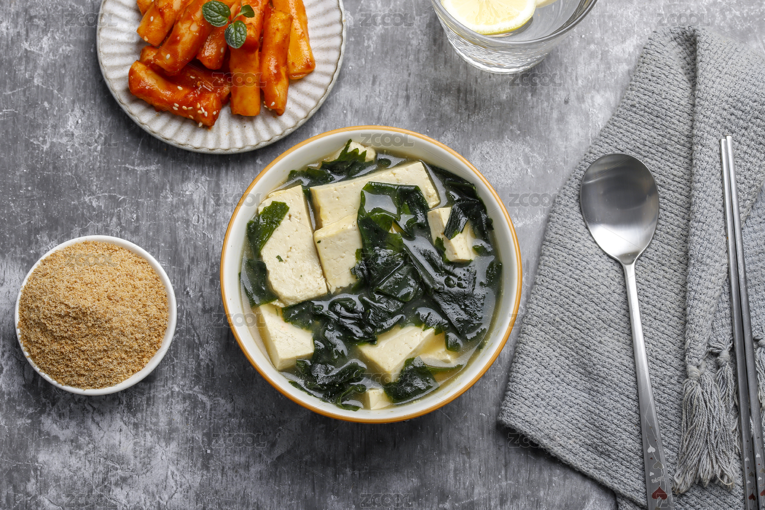 桌上的海帶湯牛肉粉和炒年糕