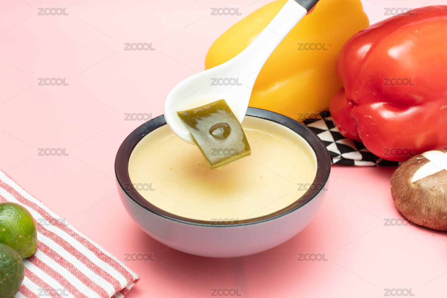 粉色桌上碗里的海帶湯