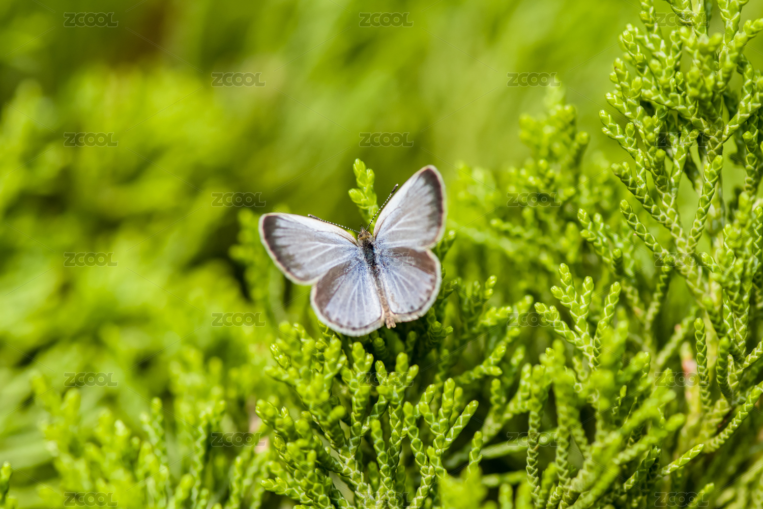 花園里一只落在龍柏樹上的蝴蝶特寫