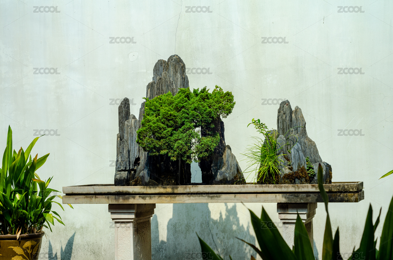 中國上海古猗園梅花廳庭院的古木-龍柏