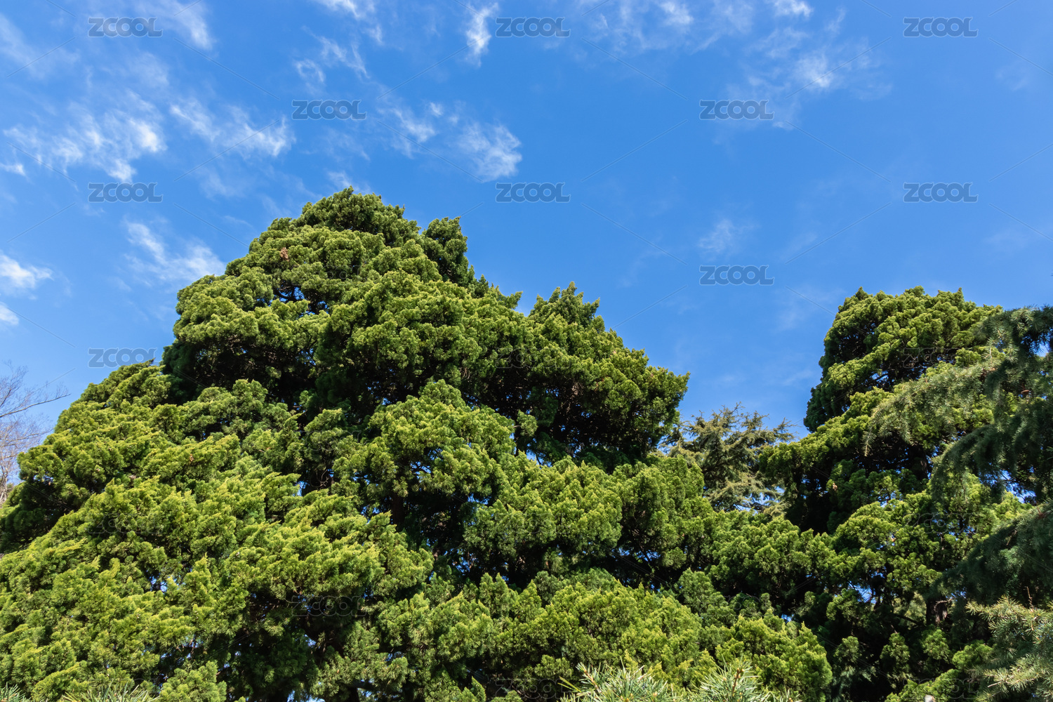 大連傅家莊公園海邊的龍柏樹和藍天白云