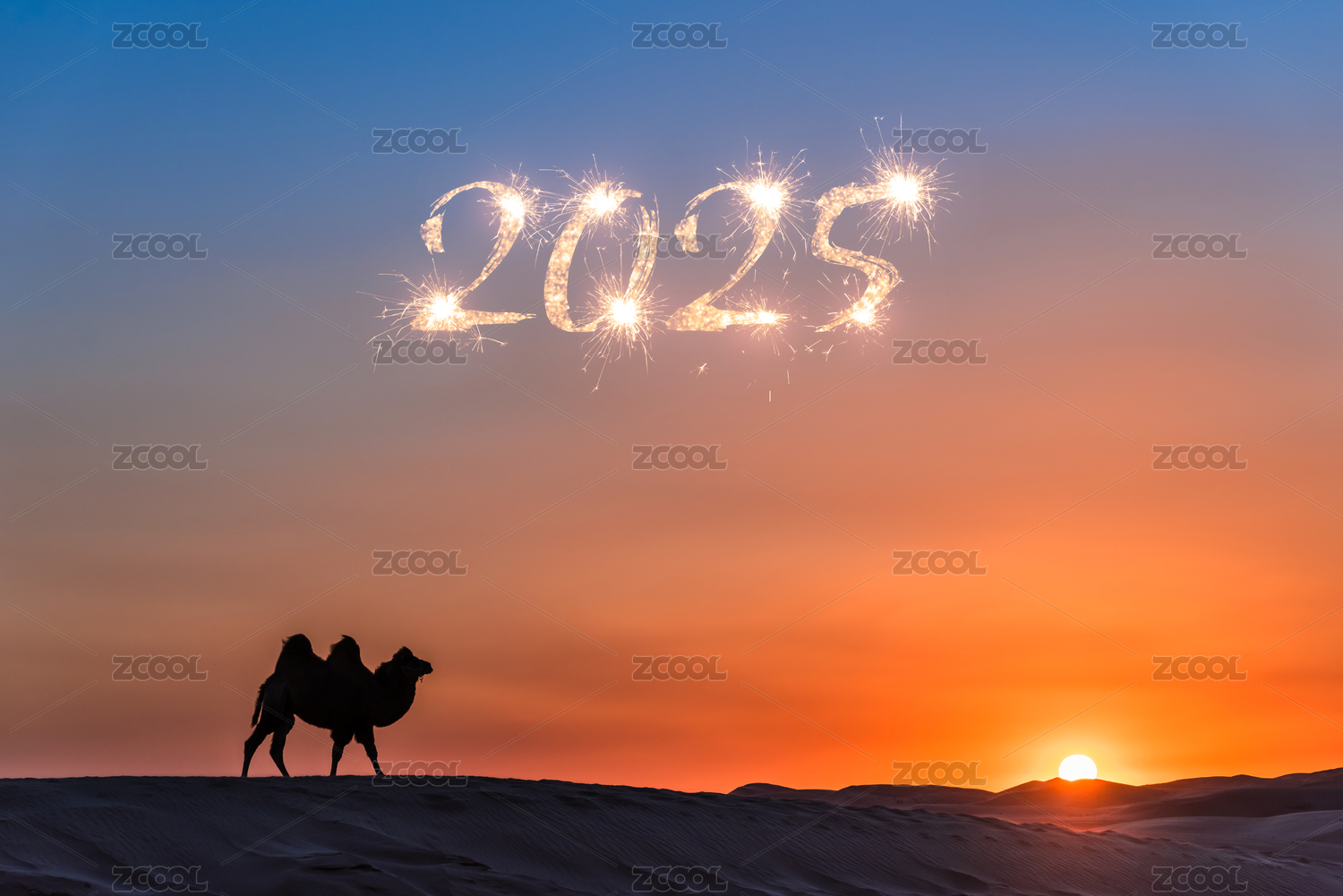 2025新年元旦跨年夕陽下的沙漠駱駝隊