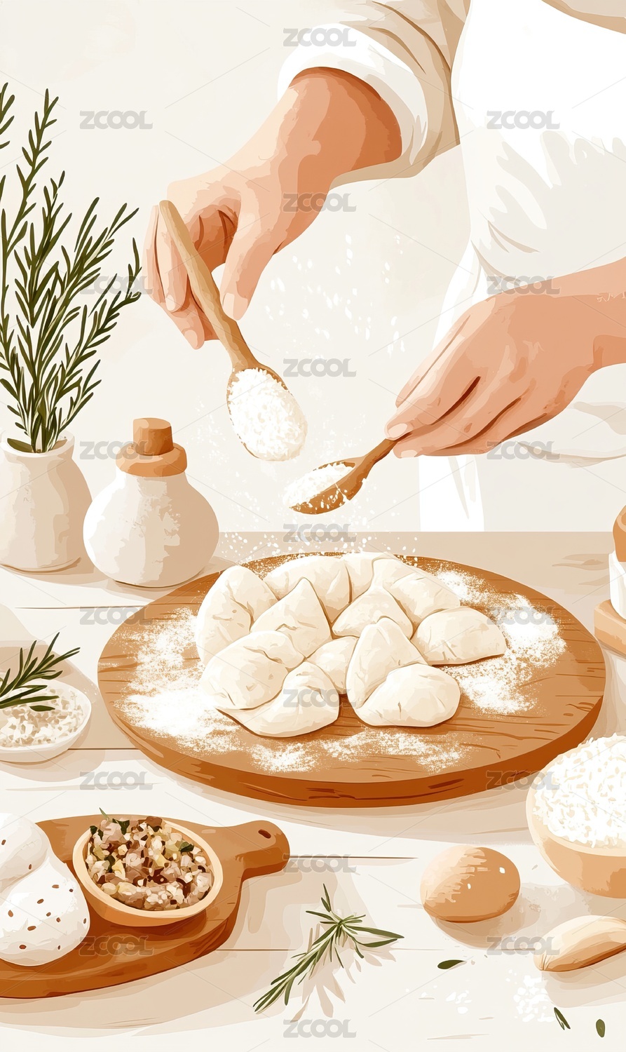 A minimalist style illustration with make pierogi, close up, scene of child's hands making dpierogi, pierogi with flour, meat filling and fresh vegetables on the table. --ar 3:5 --personalize rbqws64 --stylize 250 --v 6.1 Job ID: 9f5ed436-be4b-4b37-b0b5-e