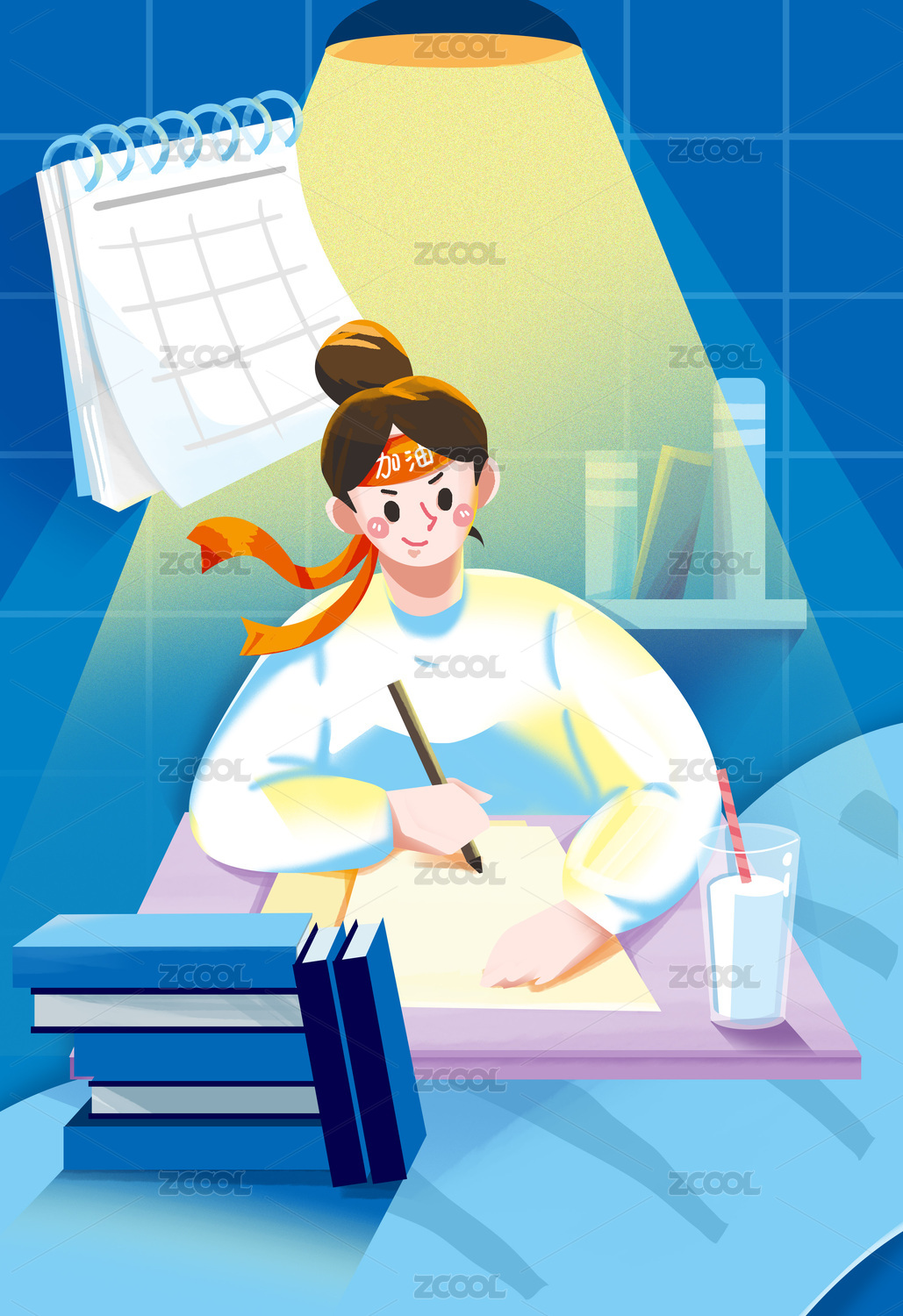 晚上少女考前桌前認(rèn)真讀書(shū)復(fù)習(xí)做題簡(jiǎn)約插畫(huà)
