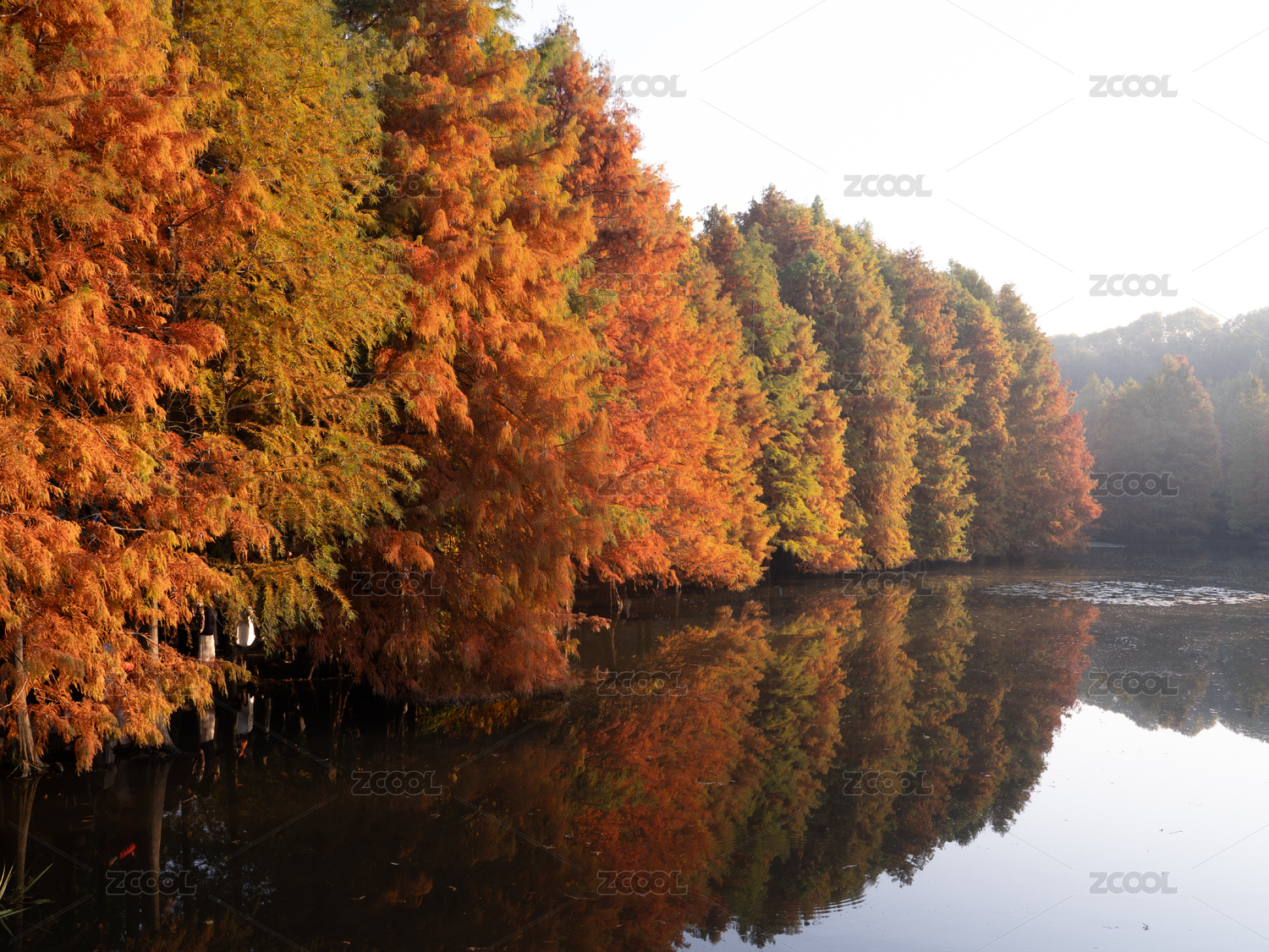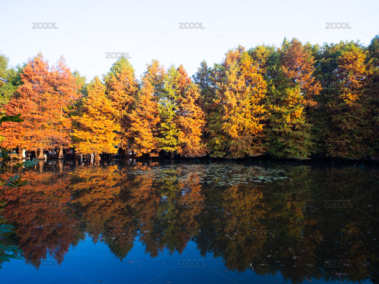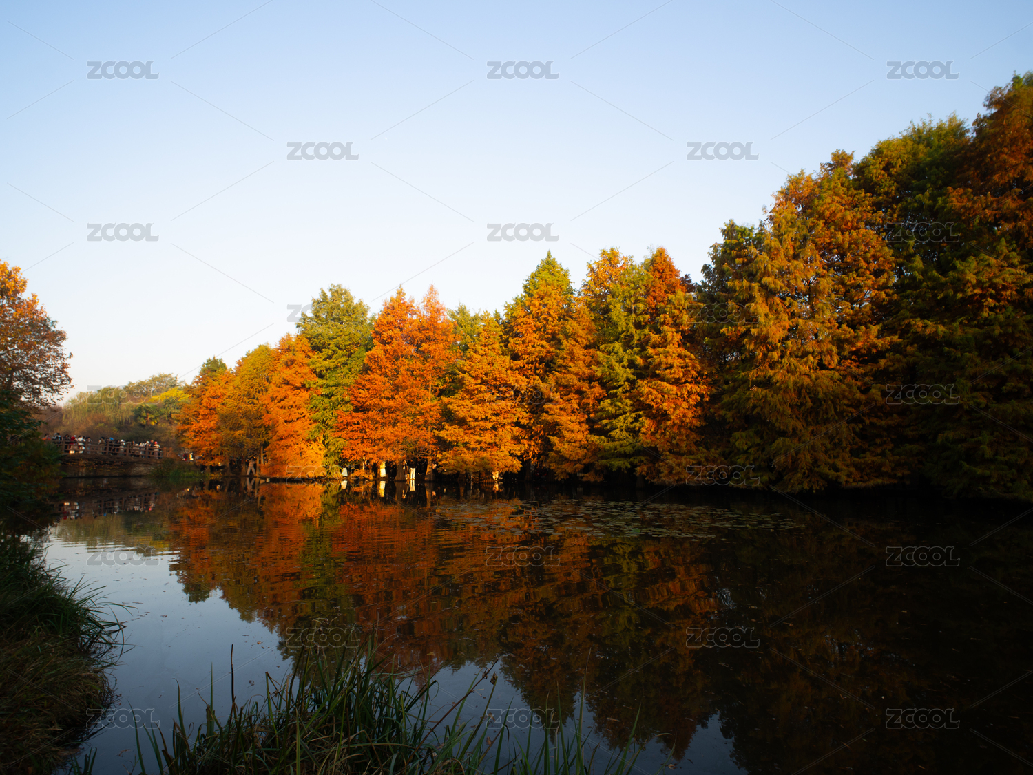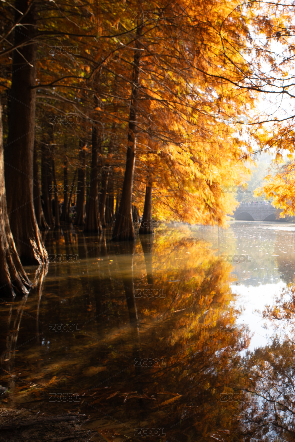 南京燕雀湖秋季紅色的落羽杉和倒影