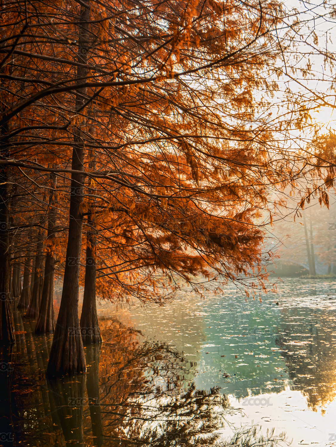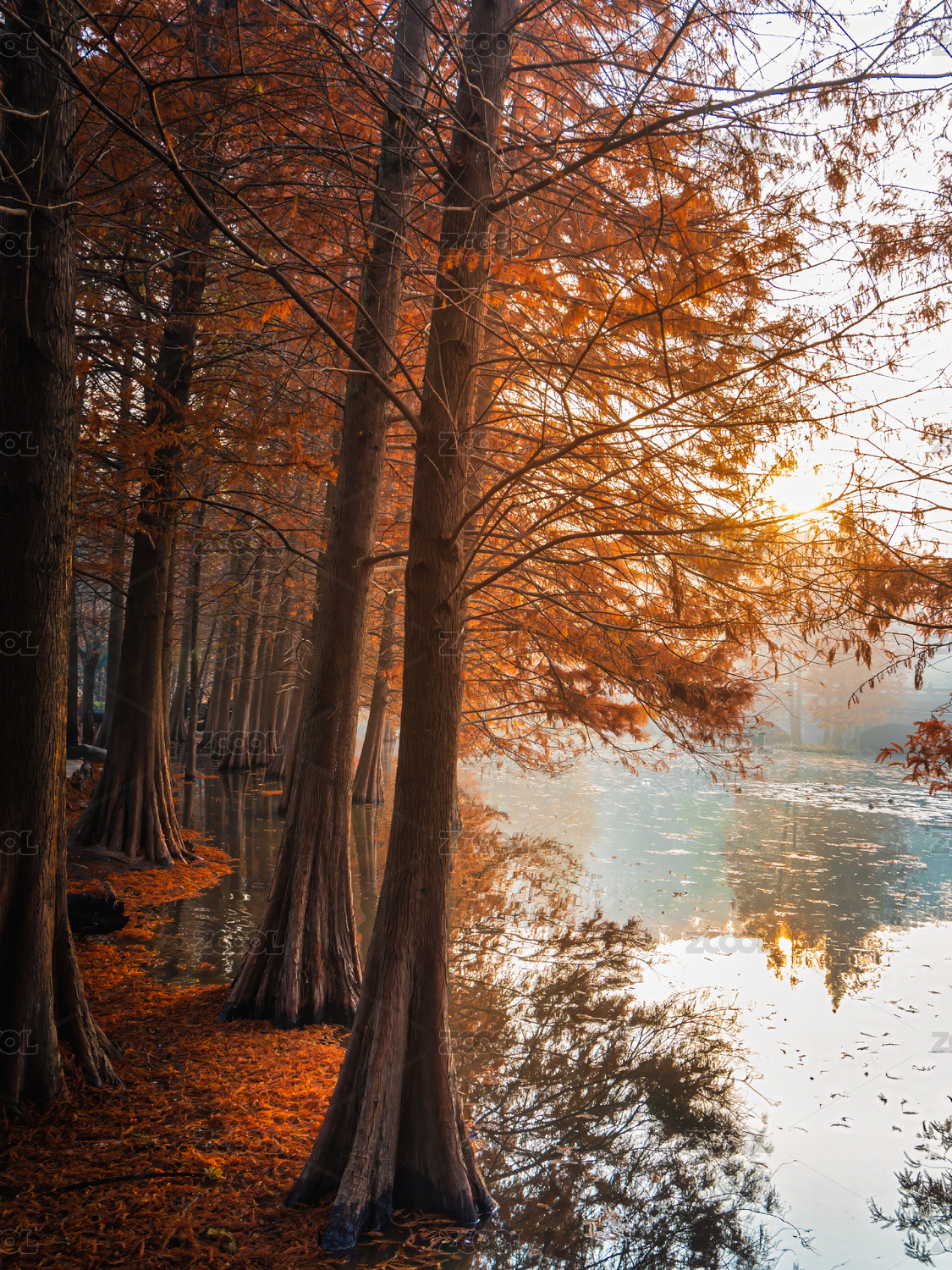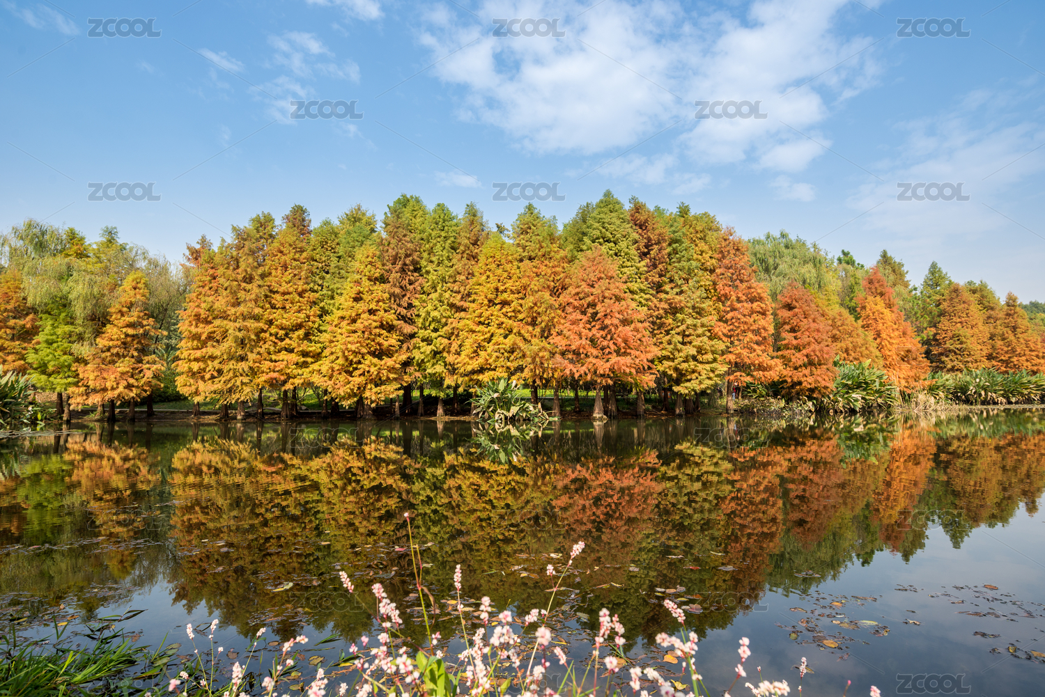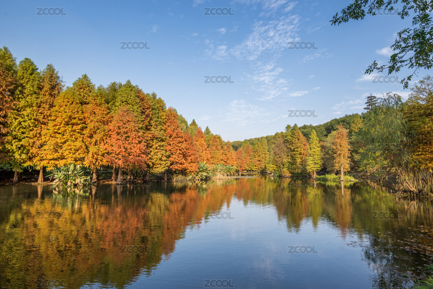 南京燕雀湖秋季紅色的落羽杉和倒影