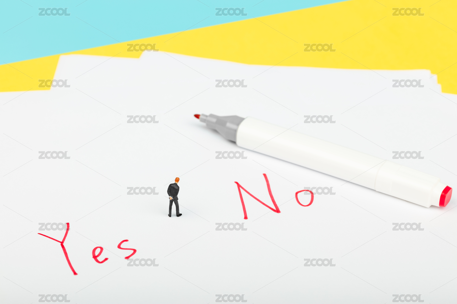 西裝男性站在紅色的Yes和No旁抉擇