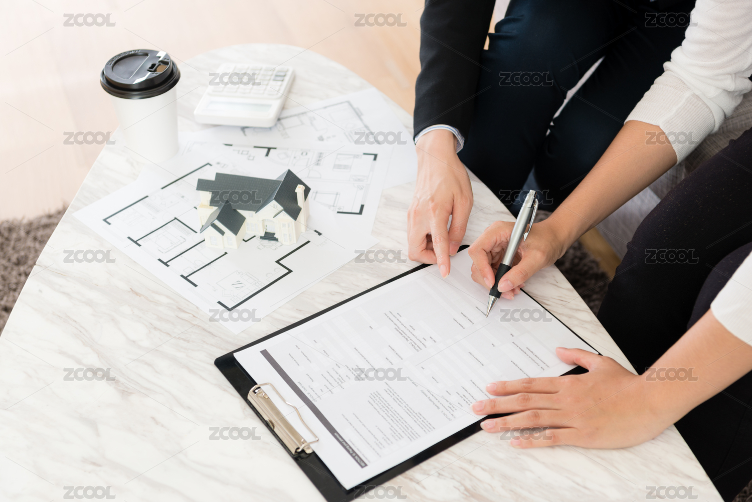 買方?jīng)Q定的俯拍的照片,以購買新的房子,簽訂合同文件在家里與代理經(jīng)理女人完成交易。