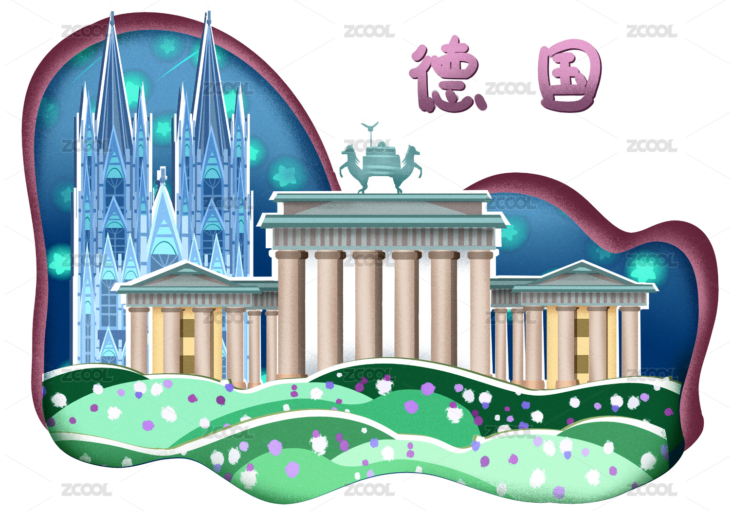 剪紙風格德國城市地標勃蘭堡門與科隆大教堂插畫