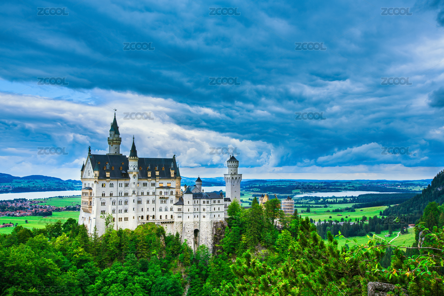 歐洲德國舊天鵝堡湖泊山脈遠景