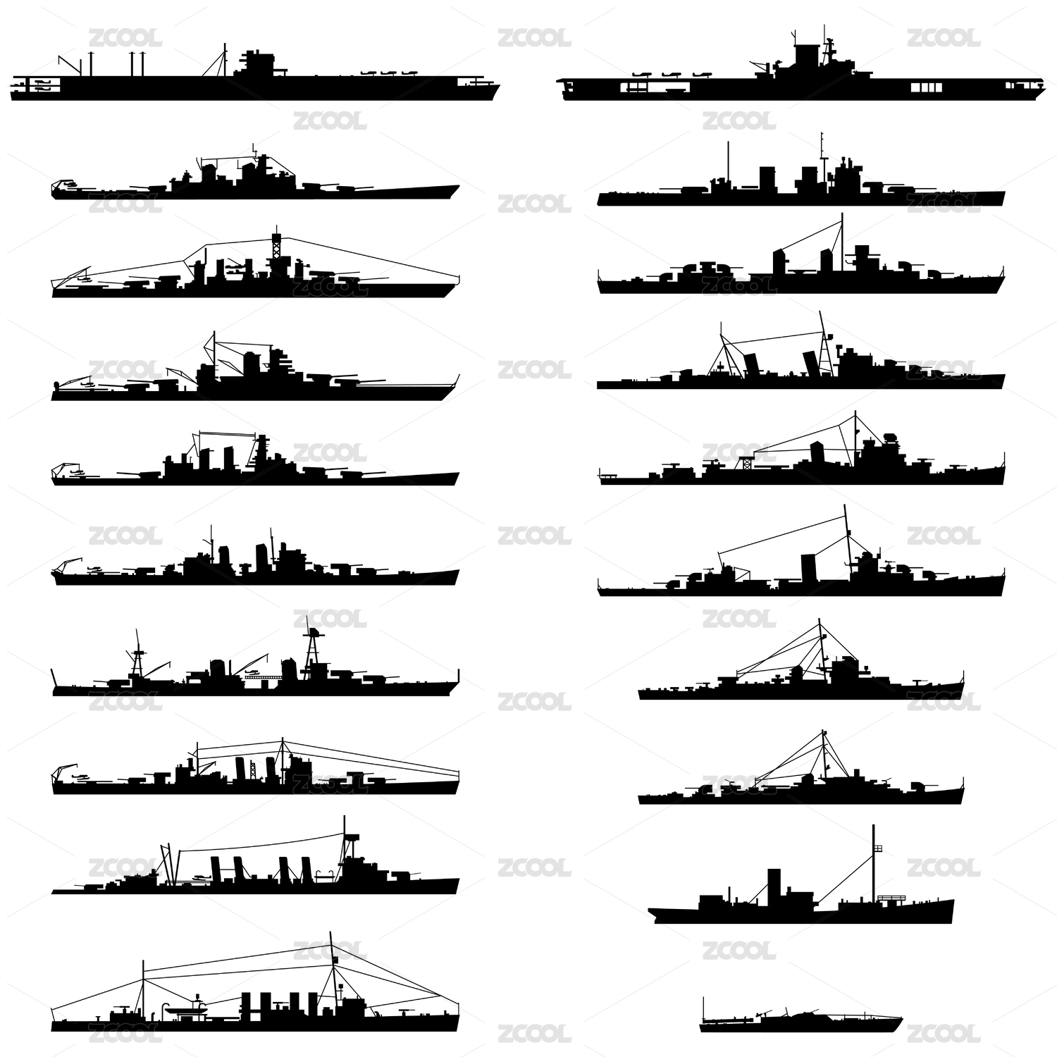 各種二戰(zhàn)時(shí)期老式戰(zhàn)艦輪廓插畫(huà)素材矢量圖