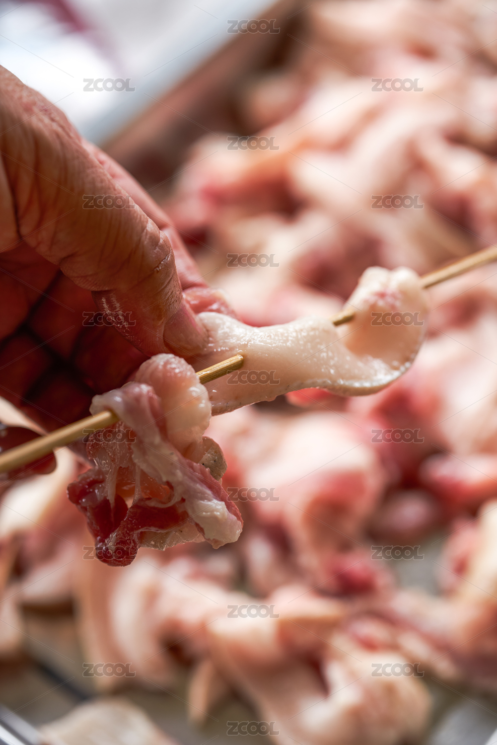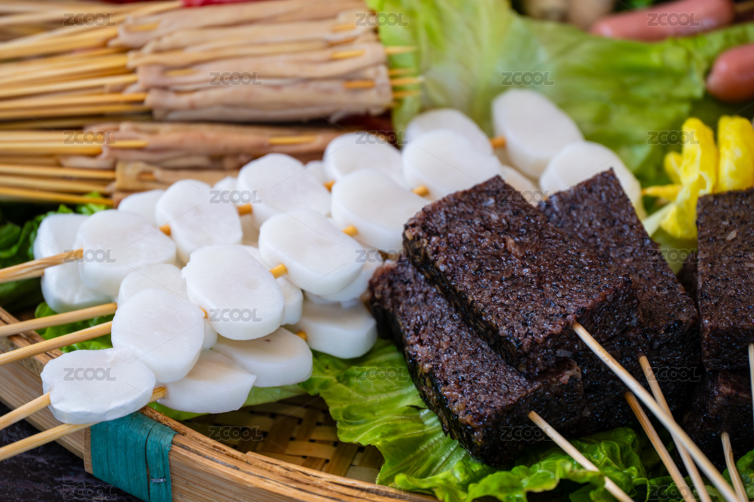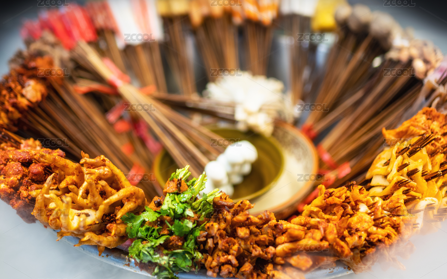 竹簽上穿的中國(guó)四川傳統(tǒng)美食火鍋串串香