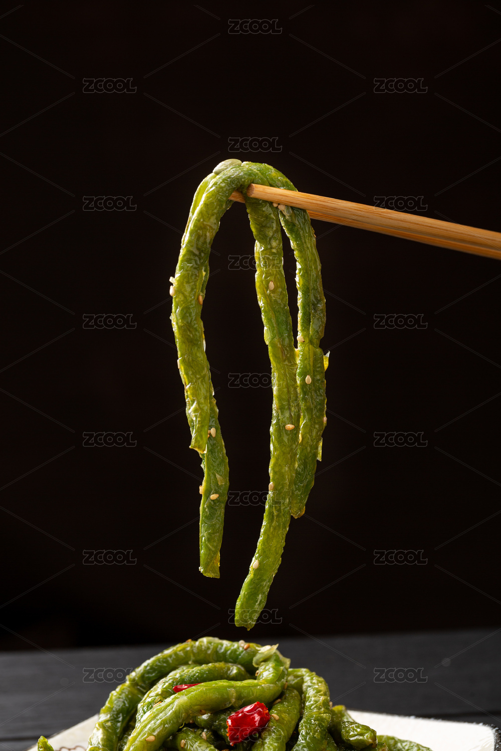筷子挑起的干煸四季豆特寫