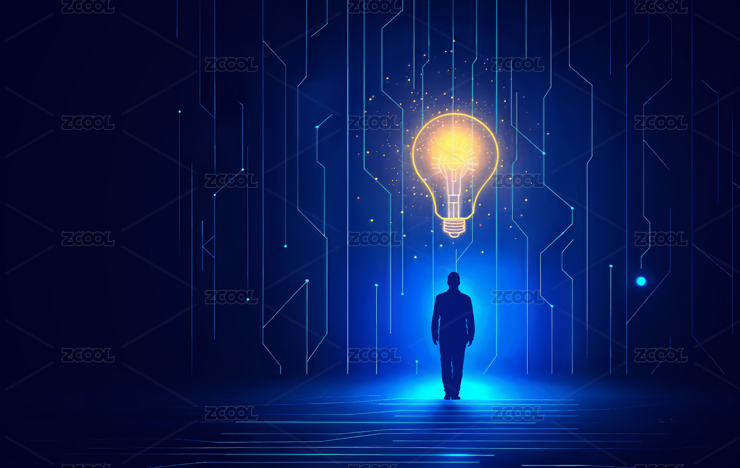 一個(gè)人在抽象虛擬空間中站在發(fā)光燈泡前