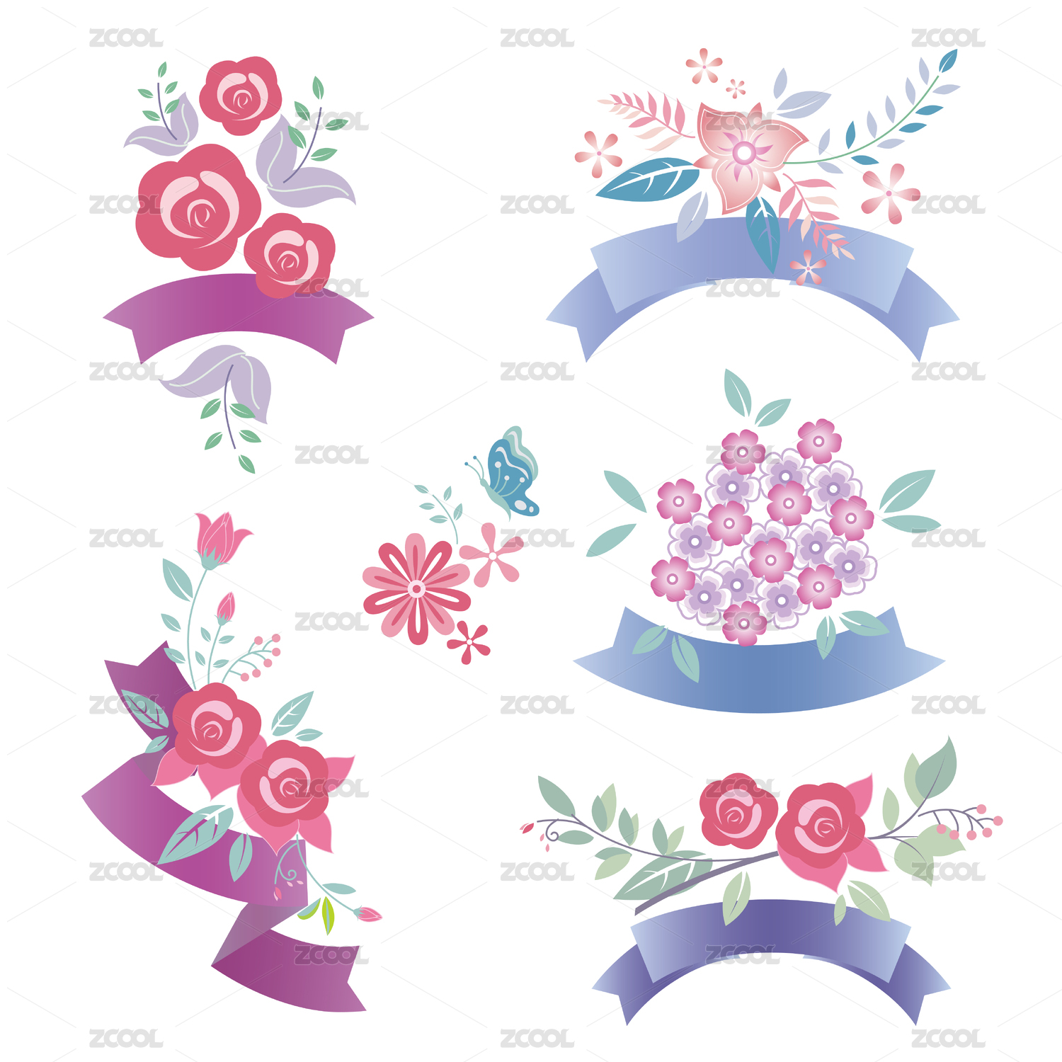 粉色清新手繪矢量花朵與飄帶