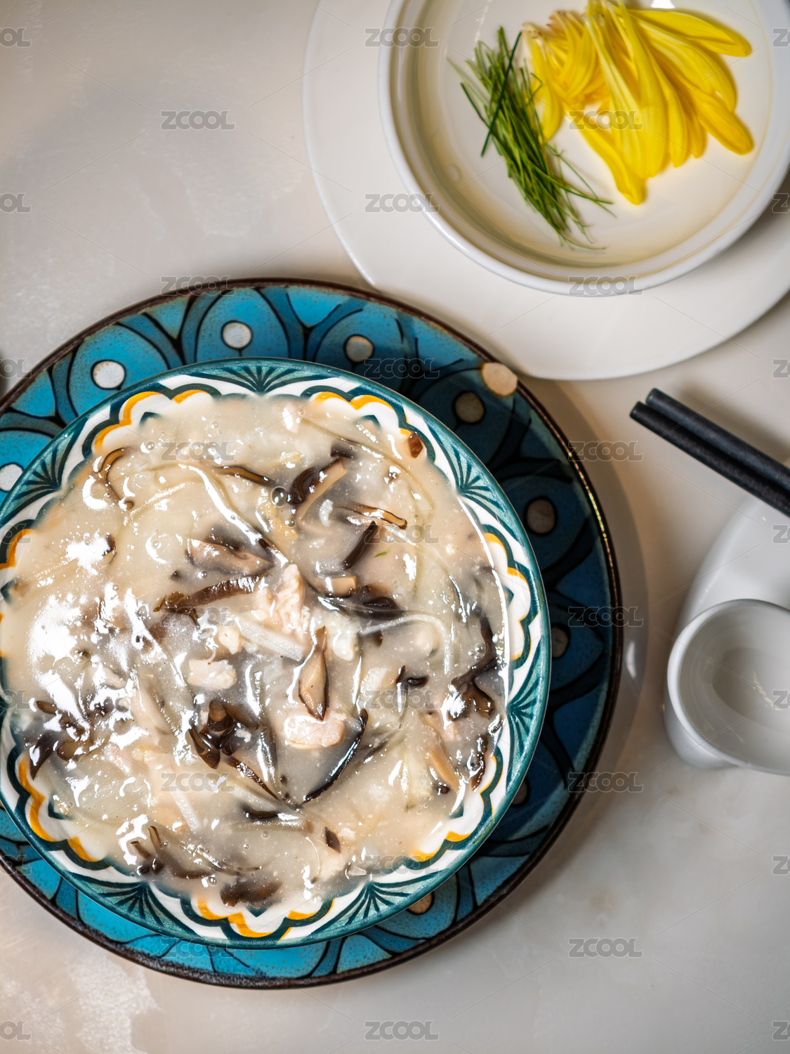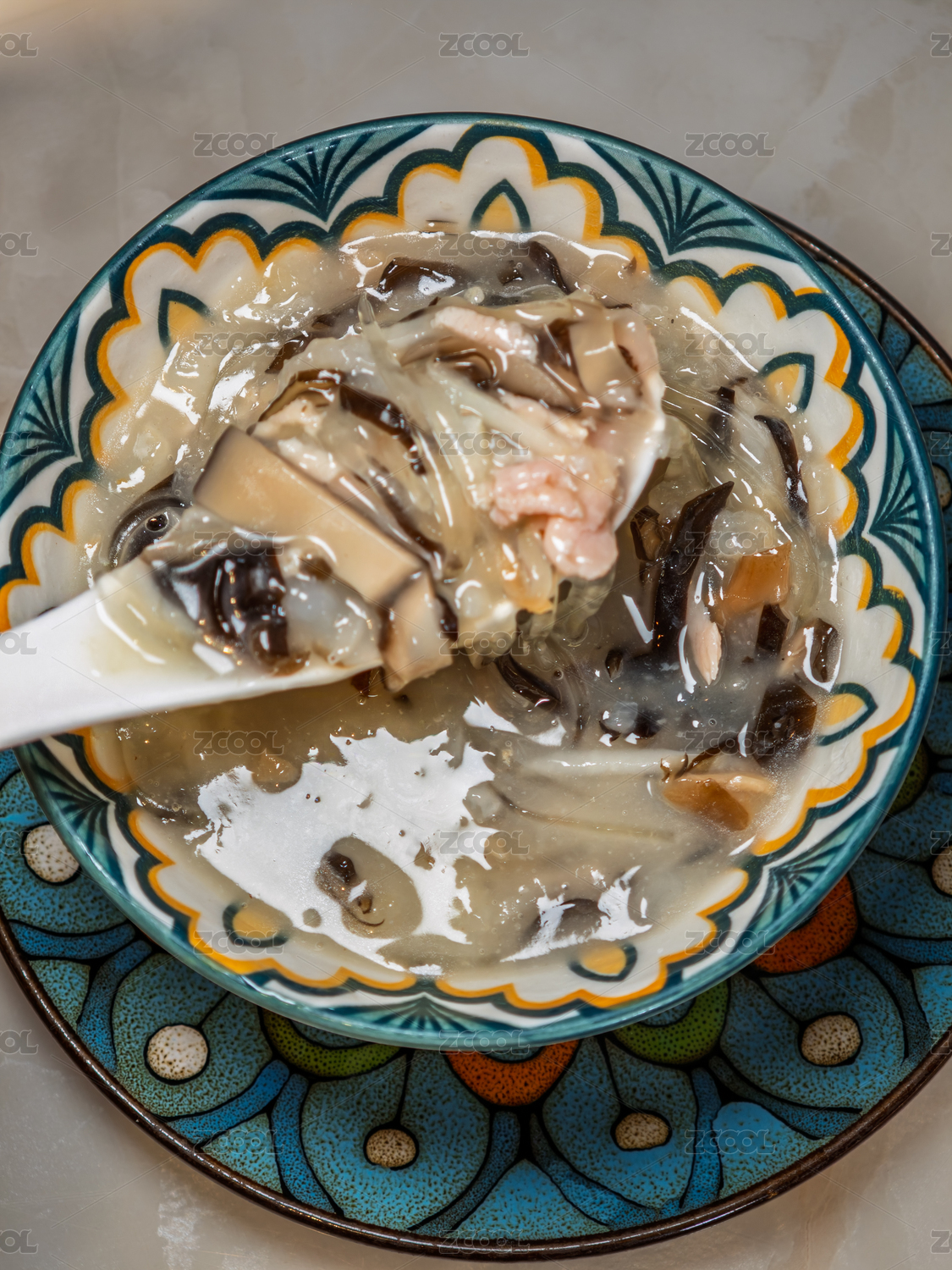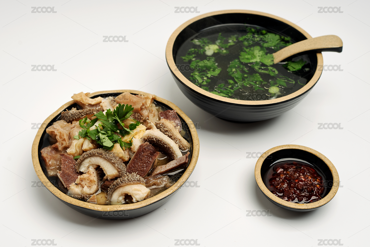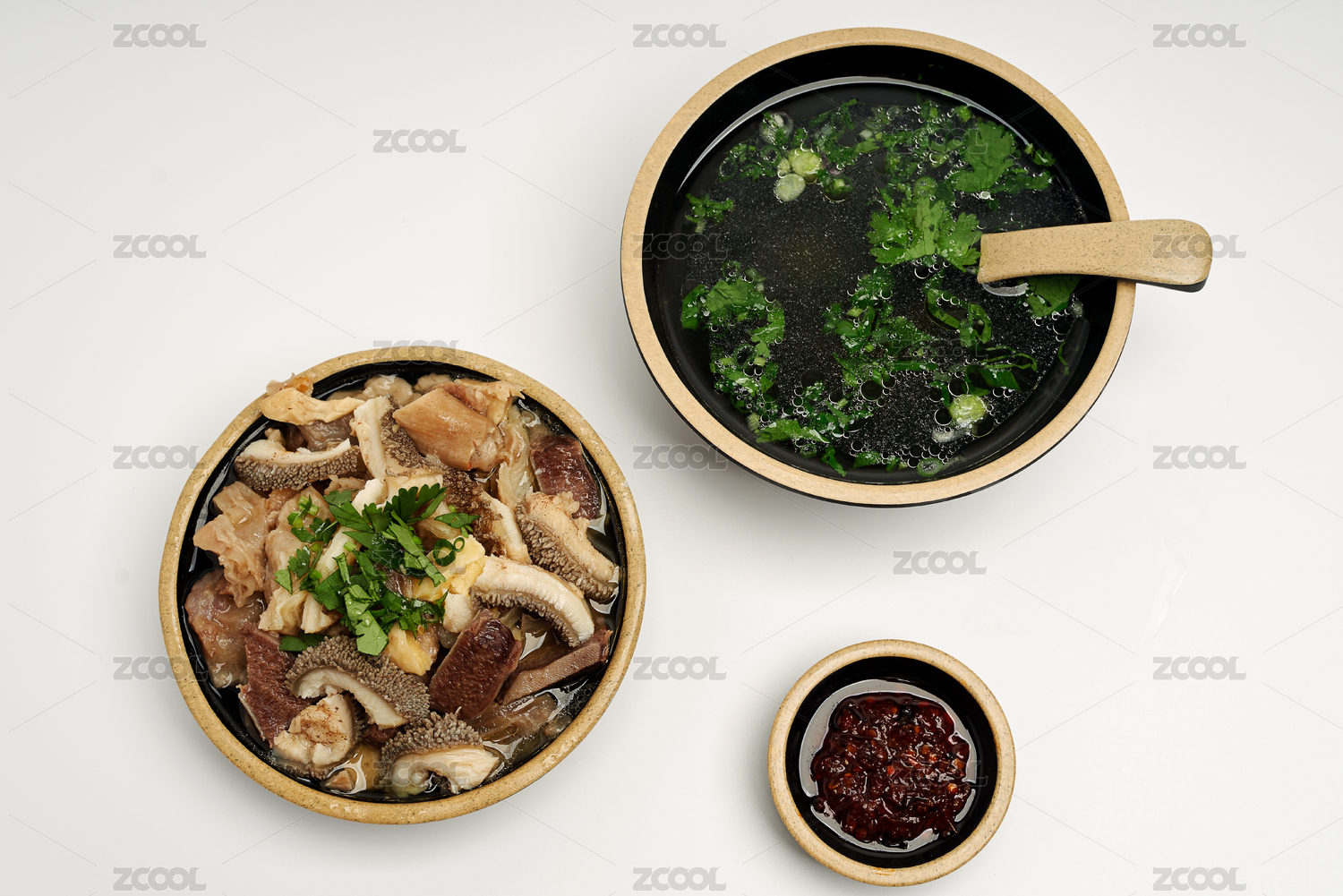放在白色桌面上的中國廣東風(fēng)味美食——一碟牛雜,一碗清湯和一份辣醬